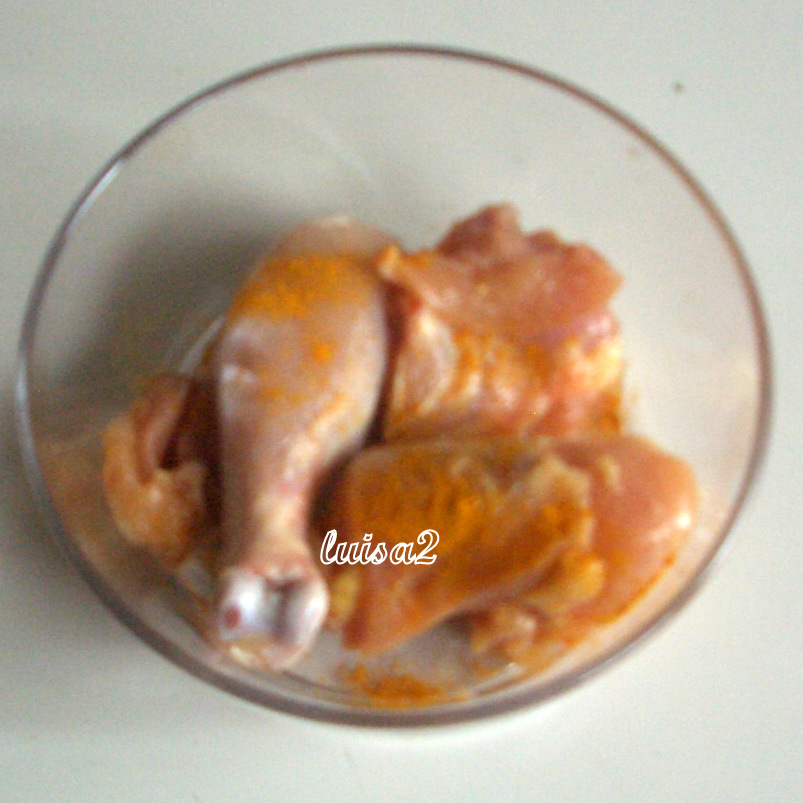 - Dividere il quarto di pollo in due pezzi, togliere la pelle, cospargerlo con la curcuma, lo zenzero, sale e pepe e farlo insaporire per mezz'ora:
