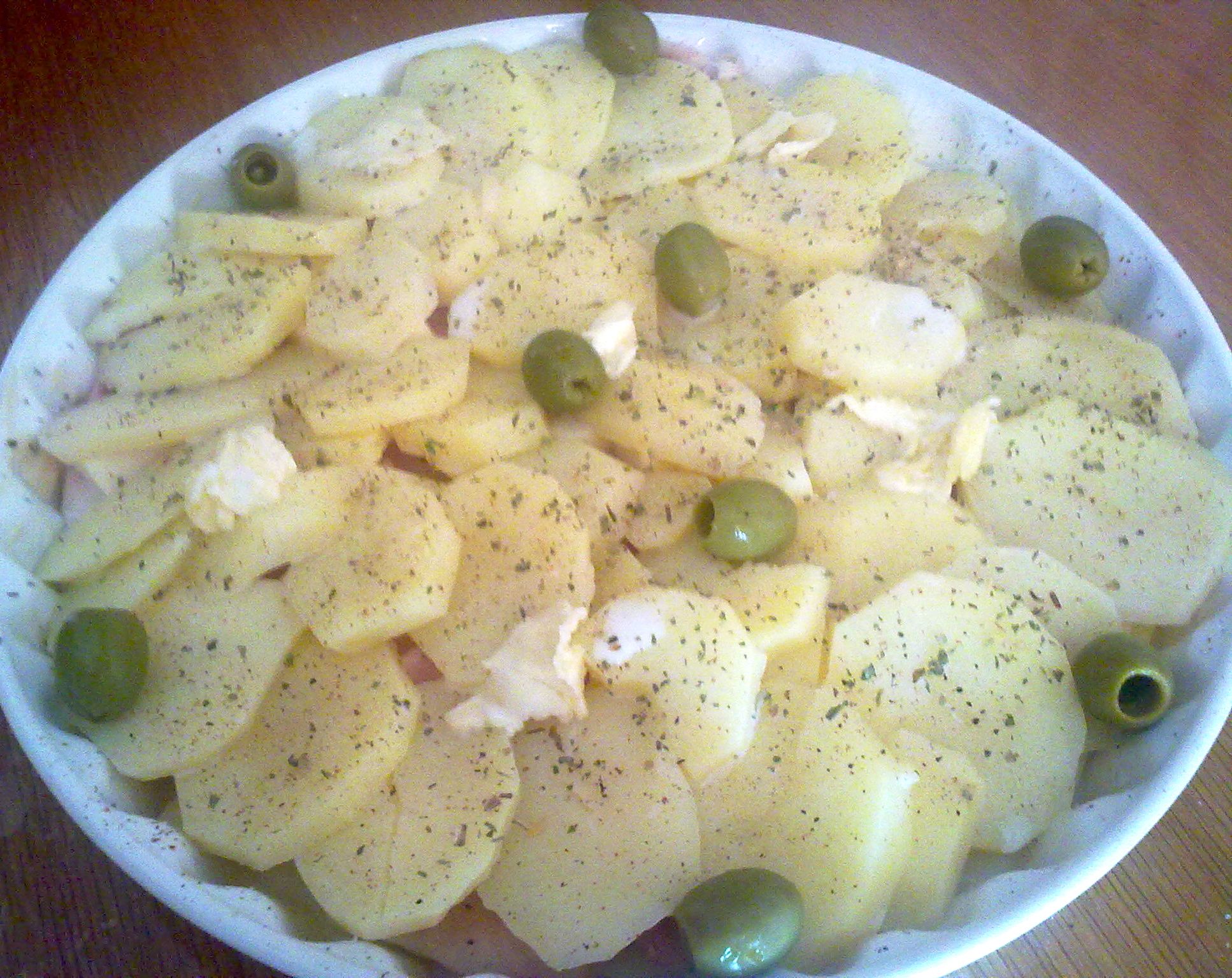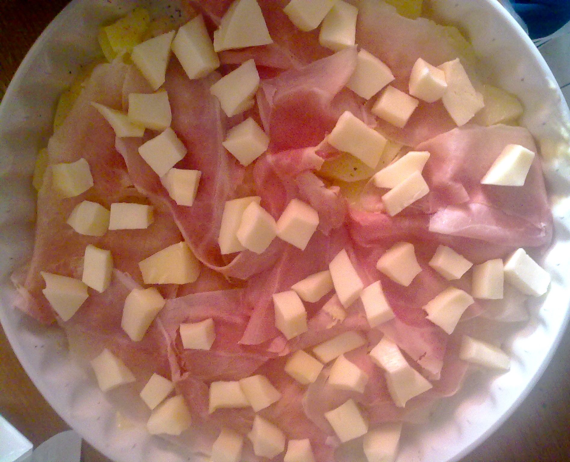 "coperchio chiuso" mettete acqua fino a coprire le lame e portate a bollore cira 6-7 min 100° vel 1, quando l'acqua bolle posizionate il varoma con le patate tagliate a rondelle e cuocete 20 min. temperatura varoma vel 2.Con la metà delle patate foderate una teglia unta di burro, insaporitele con sale e noce moscata, adagiatevi sopra il prosciutto cotto e la fontina a cubetti. Chiudete con un secondo strato di patate, insaporite di nuovo con sale e noce moscata, aggiungete un po' di origano, qualche fiocchetto di burro e decorate con una decina di olive. Irrorate il tutto con il latte.