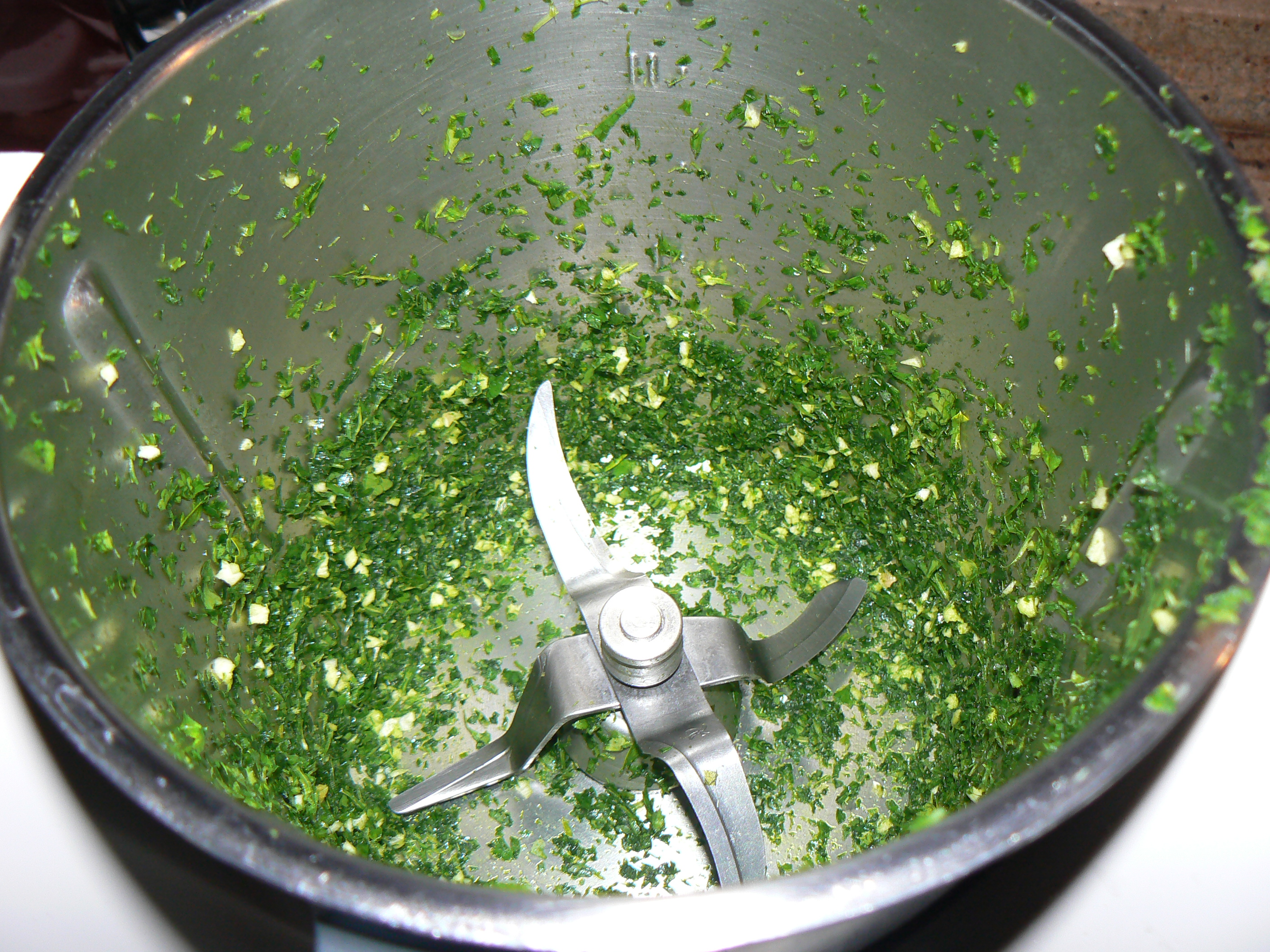 "coperchio chiuso" aglio e prezzemolo e tritare 10 sec. vel.7. Mettere da parte il trito. Senza lavare il