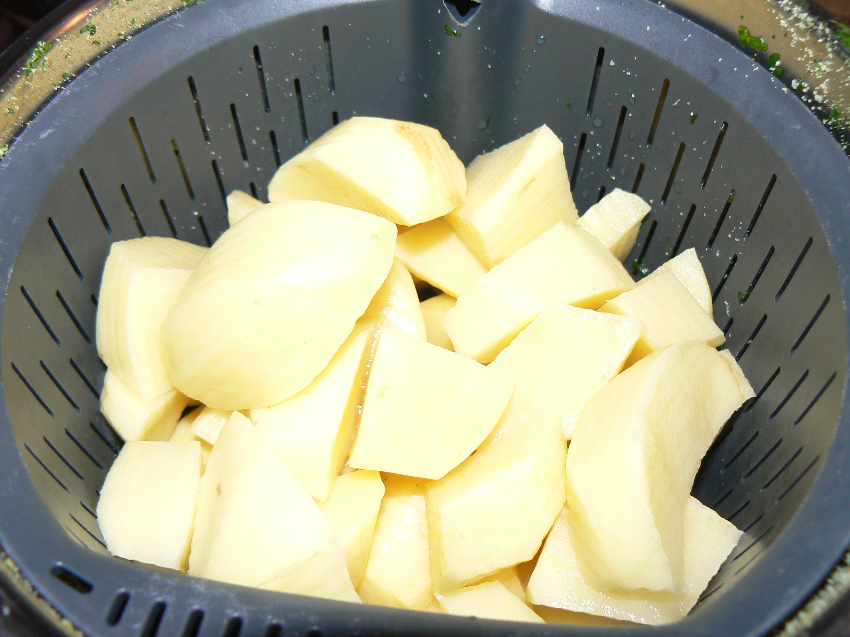 "coperchio chiuso" inserire 500 gr di acqua, posizionare il cestello e sistemarvi le patate tagliate a tocchetti. Cuocere per 25 min. vel.1 temp.100. Una volta cotte mettere da parte le patate, gettare l'acqua di cottura rimasta e mettere nel