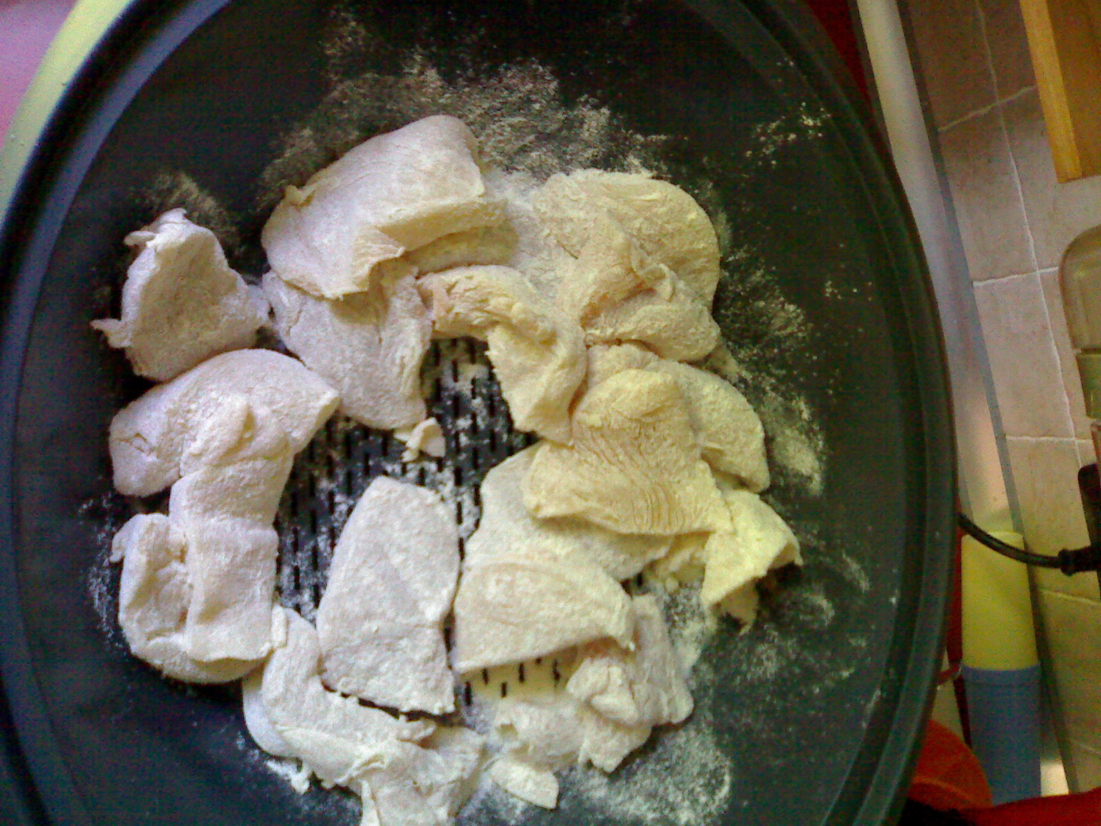 6. Tagliare a tocchetti il pollo, infarinarli e salarli. Ungere leggermente il varoma e sistemarvi il pollo lasciando un pò di spazio al centro x far circolare il vapore.