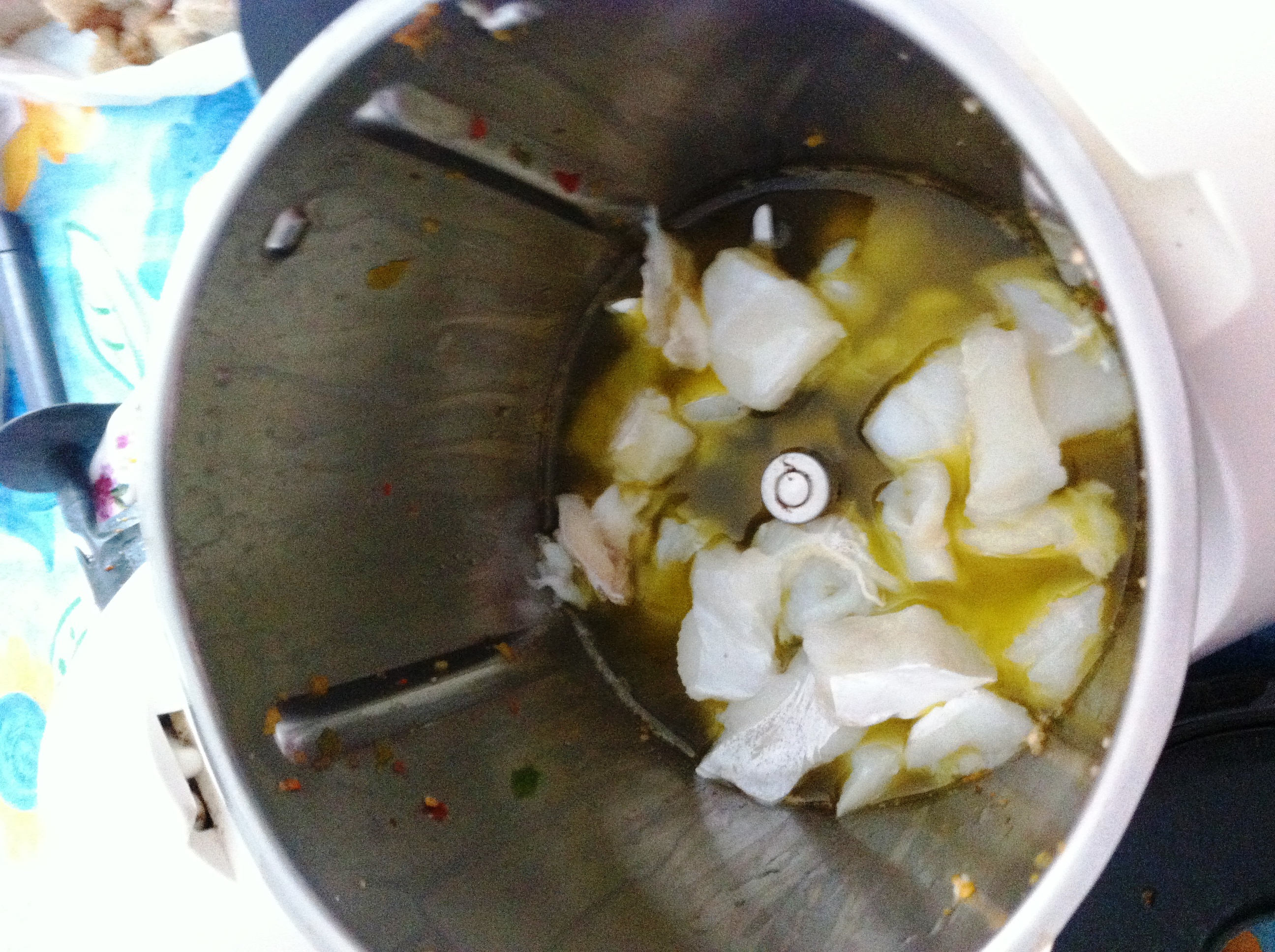 aggiungere il baccalà tagliato a pezzi, il pane a dadini e rosolare per 4m 100° a velocità 1;