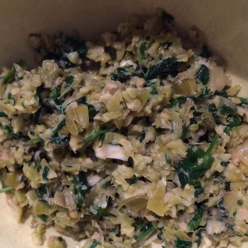 "coperchio chiuso" i capperi, le olive, il prezzemolo e l'aglio e tritare a vel 7 per 15 sec. Trasferire il tutto in una ciotolina da parte.Senza lavare il