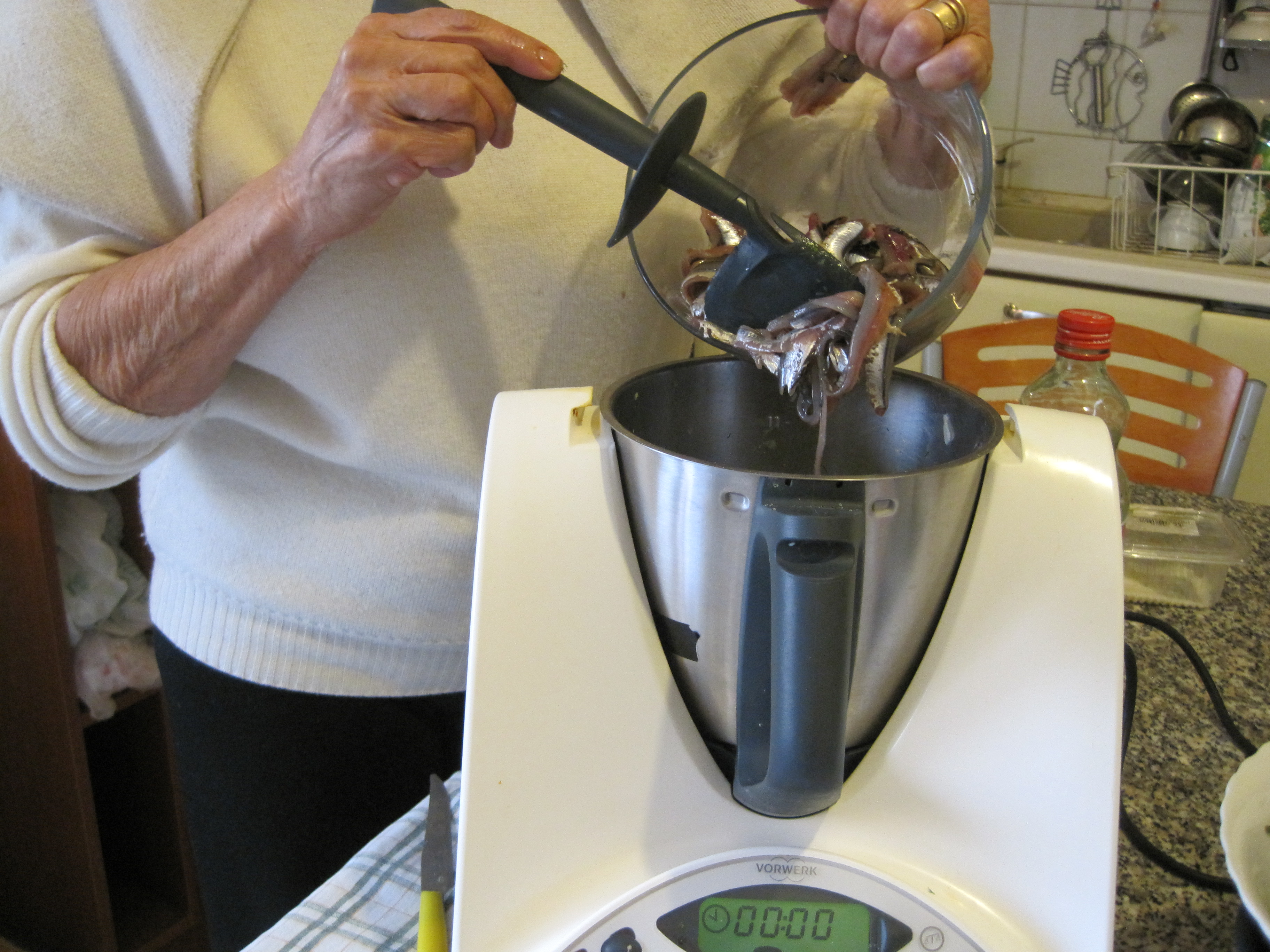 7. Senza lavare il boccale, inserirvi le cipolline e tritare: 4 sec./vel. 6.