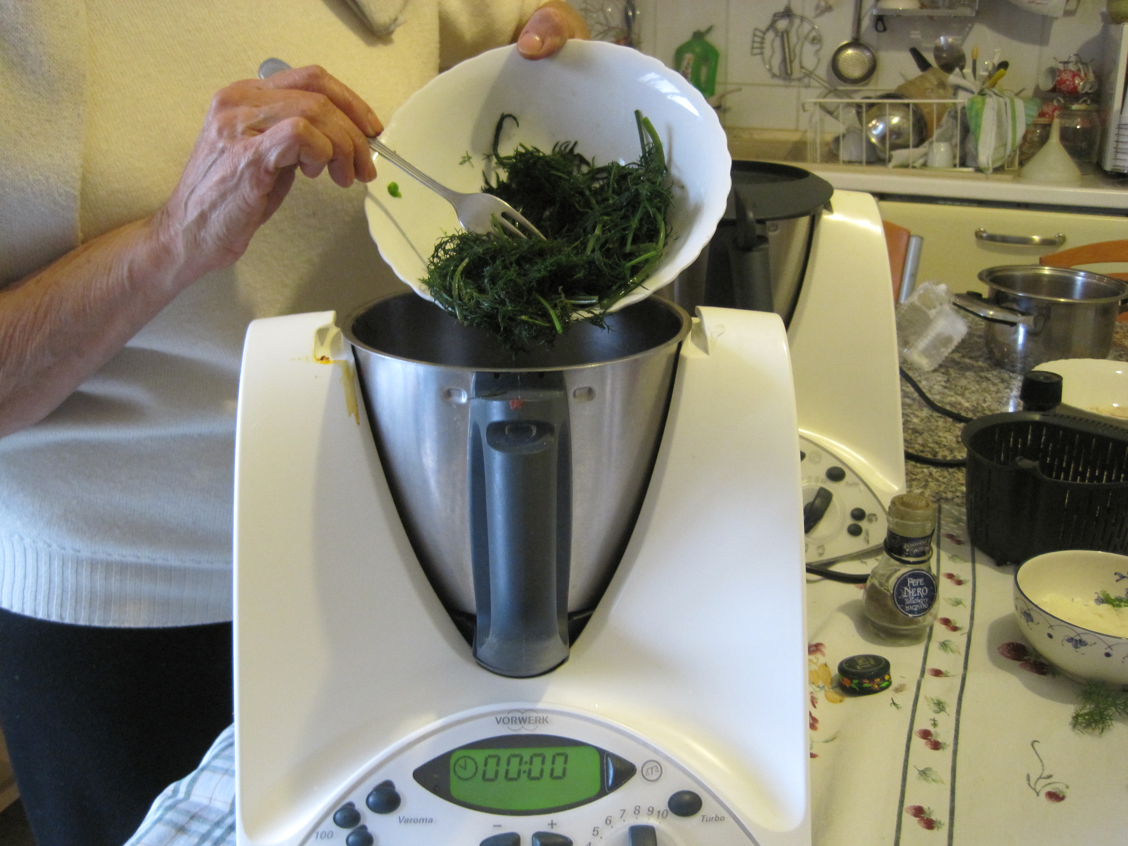 5. Senza lavare il boccale, inserirvi nuovamente le barbette di finocchietto insieme a tutti gli altri ingredienti per il pesto, omogeneizzare: 15 sec./vel. 8, spatolare e continuare per altri 20 sec./vel. 8.