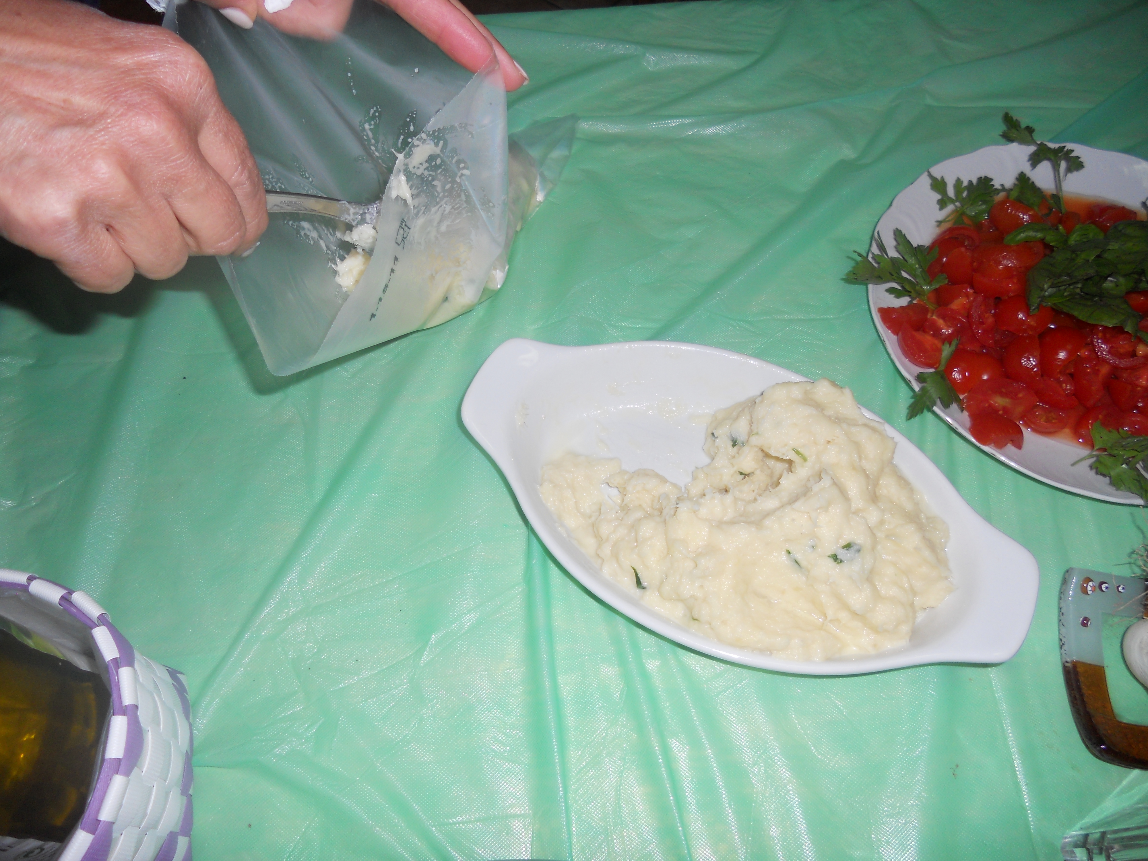 "antiorario" vel.1.Togliere l'aglio aggiungere le patate tagliati a dadini molto piccoli , il baccalà dissalato e tagliato a pezzettini , il latte e cuocere 20 min. 100 gradi vel.2 fino ad ottenere un composto asciutto , completare con il prezzemolo tritato e il pepe bianco e sale q.b.