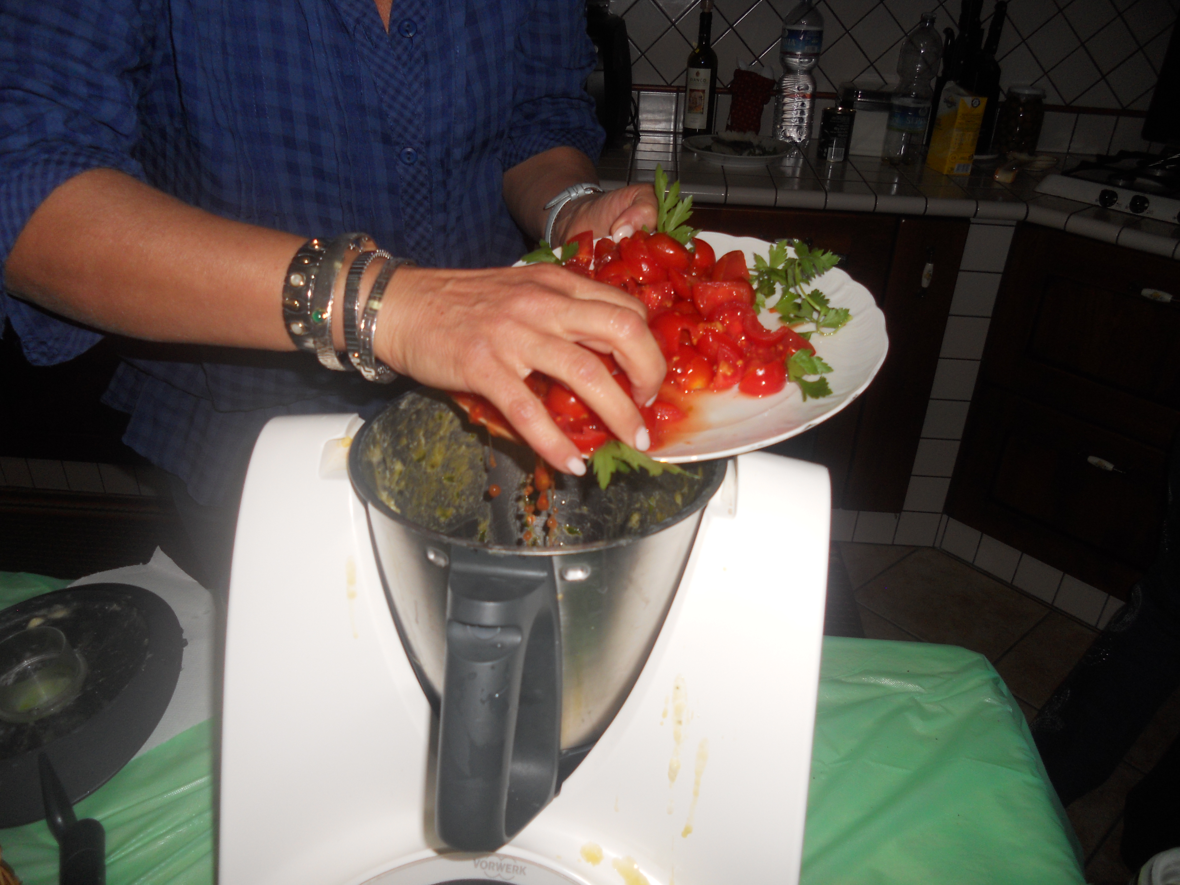 Senza lavare il boccale mettere l'aglio , i pomodorini tagliati in 4 , l'olio , 100 gr di acqua e cuocere 20 min. temp.varoma vel. 1