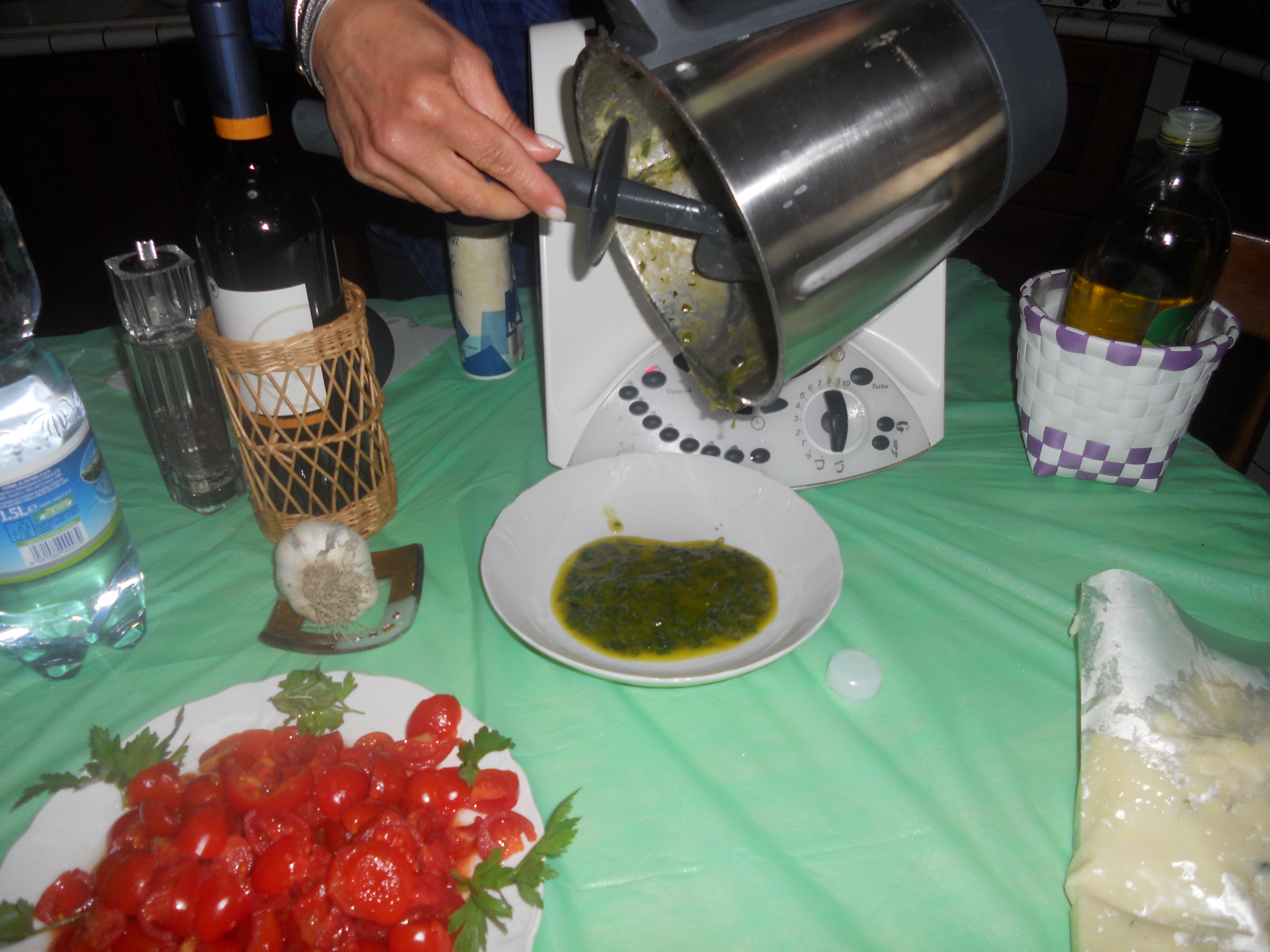 Mettere nel boccale 5 o 6 foglie di basilico con poca acqua frizzante , sale q.b. e 30 gr di olio extravergine di oliva e emulsionare il tutto 20 sec. vel.6.