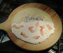 Girare e cuocere per un altro minuto.Ripetere fino ad esaurimento della pastella. - Sulla metà parte della crepes,stendere un po'di farcia e qualche pezzetto di salmone e ripiegarla