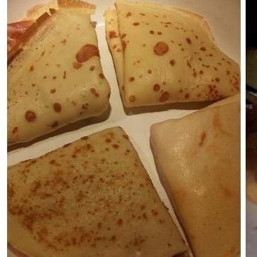 Cuocere un mestolo di pastella alla volta. Ogni mestolo uscirà una crepes. Cuocere qualche minuto per lato.farcire a piacere.chiuderle in 4e metterle in una padella con coperchio.Far scaldare qualche minuto per lato finché si scioglie un po'il formaggio all'interno. (Io avevo fatto prosciutto cotto, Asiago a fettine e grana).