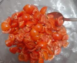 Amalgamare. - Con una forchetta pestare leggermente i pomodorini per far uscire tutto il succo.