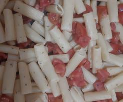 - Aggiungere i pomodorini (senza prendere l'emulsione del sughetto dei pomodorini e l'olio che useremo dopo) e la mozzarella tritata e ben sgoccioalta.