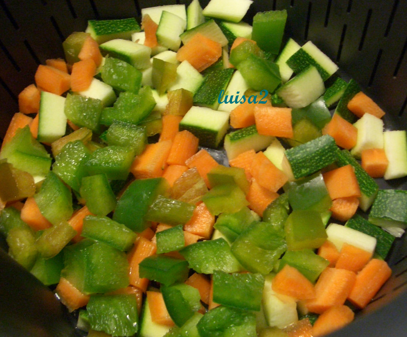 Tagliare a tocchetti piccoli la carota, lo zucchino e il peperone e metterli nel cestello