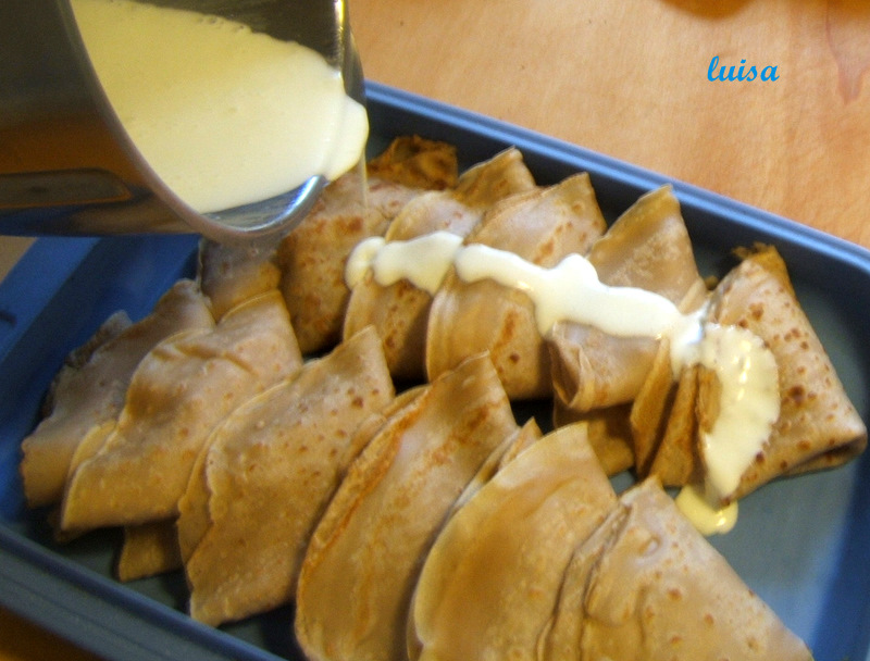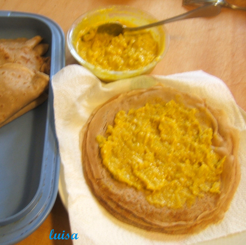 "velocità soft" , unire i formaggi e farli sciogliere: 3 min 80° vel 3Stendere sulle crespelle la farcia e piegarle in 4, porle in una teglia leggermente accavallate, versarvi sopra la salsina di formaggi e mettere in forno caldo a 180° ventilato per 20 min (controllare che non coloriscano troppo, se no dopo 10 minuti coprirle con un foglio di alluminio)