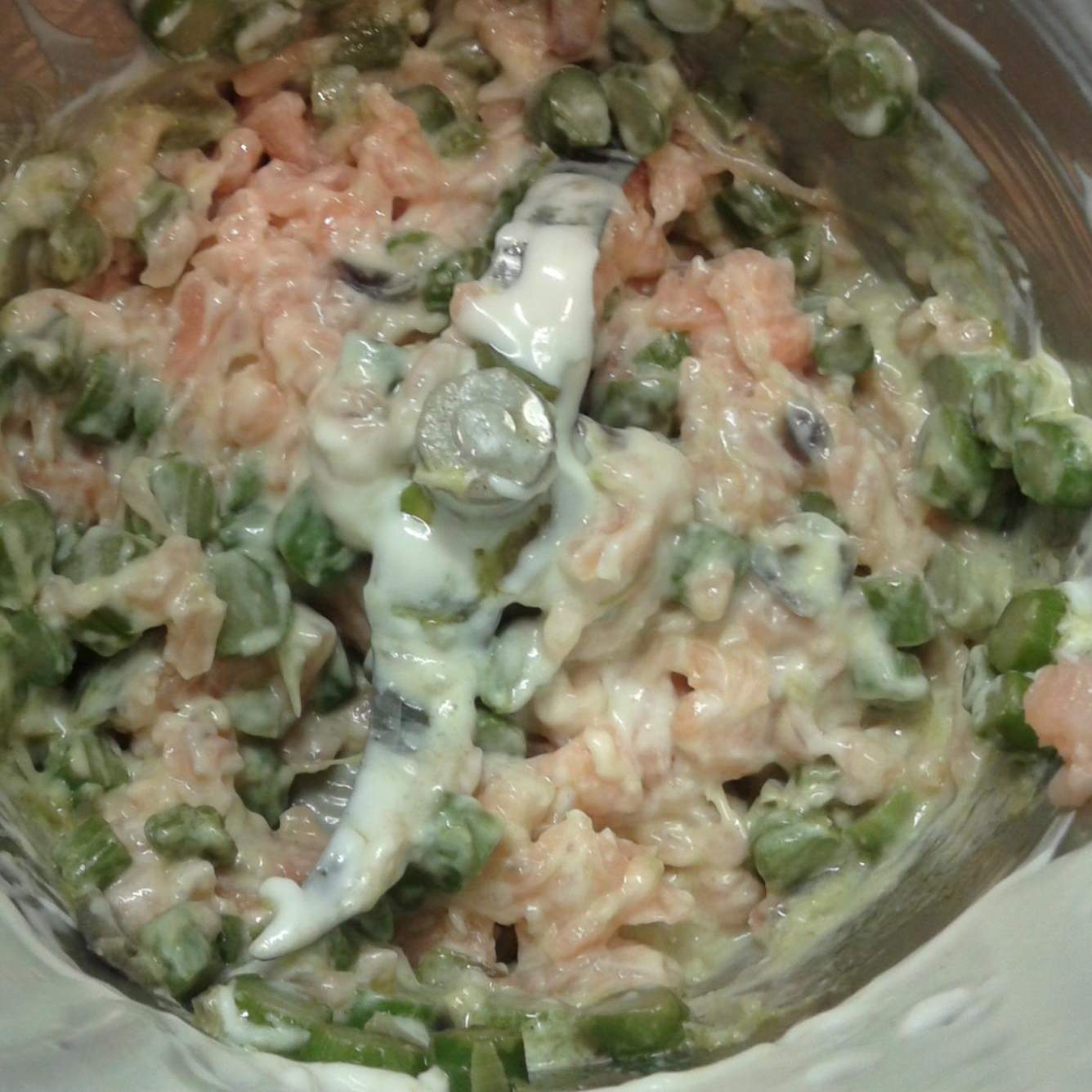 "coperchio chiuso" metterci dentro nuovamente gli asparagi, tenendo da parte le punte, aggiungere il salmone tagliato grossolanamente e 40 grammi di besciamella: amalgamare il tutto per20 sec.,