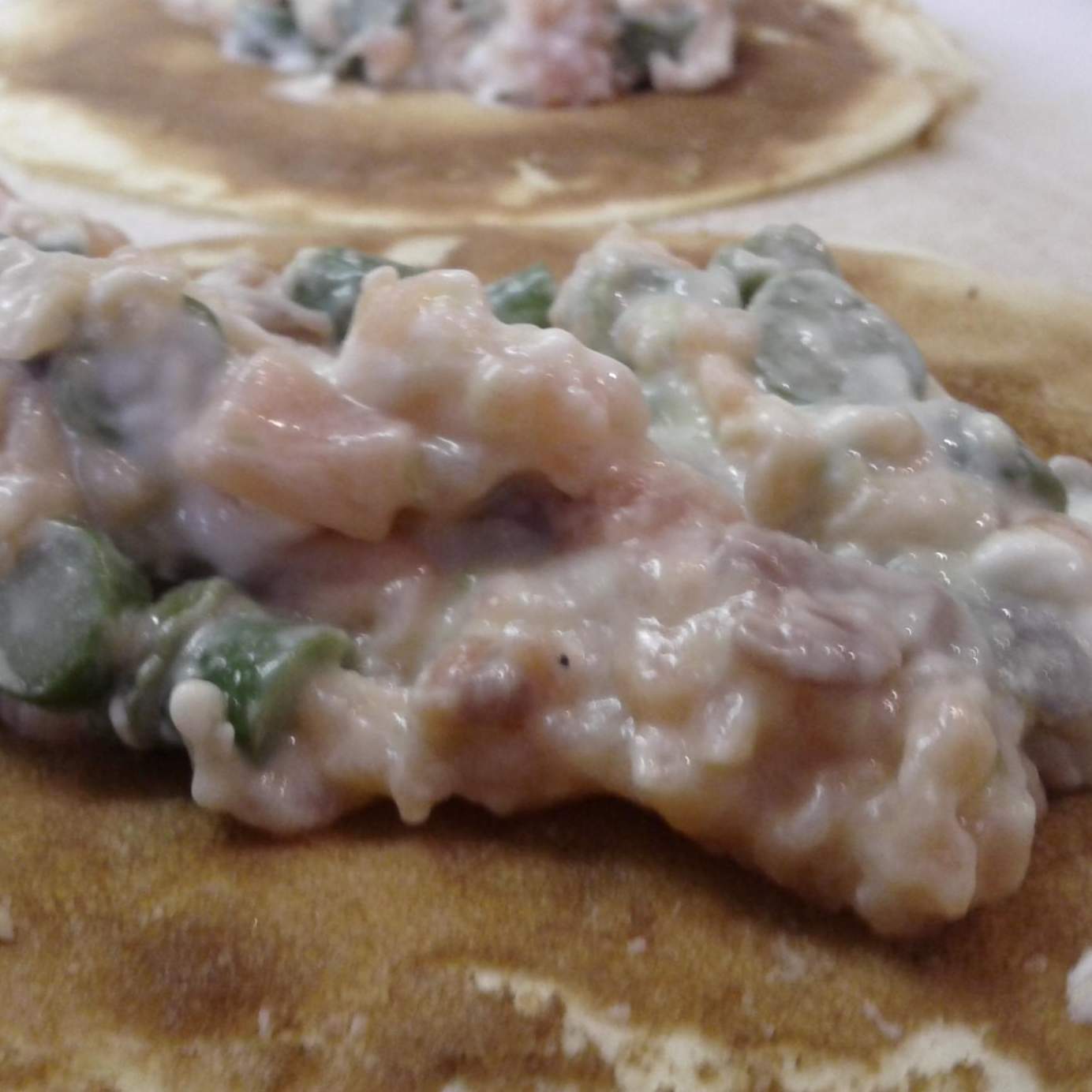 Su ogni crespella porre un po' di farcia (dividetela tra le quattro crespelle) e richiuderla nel modo che più vi aggrada, ad esempio arrotolandole a cannellone.