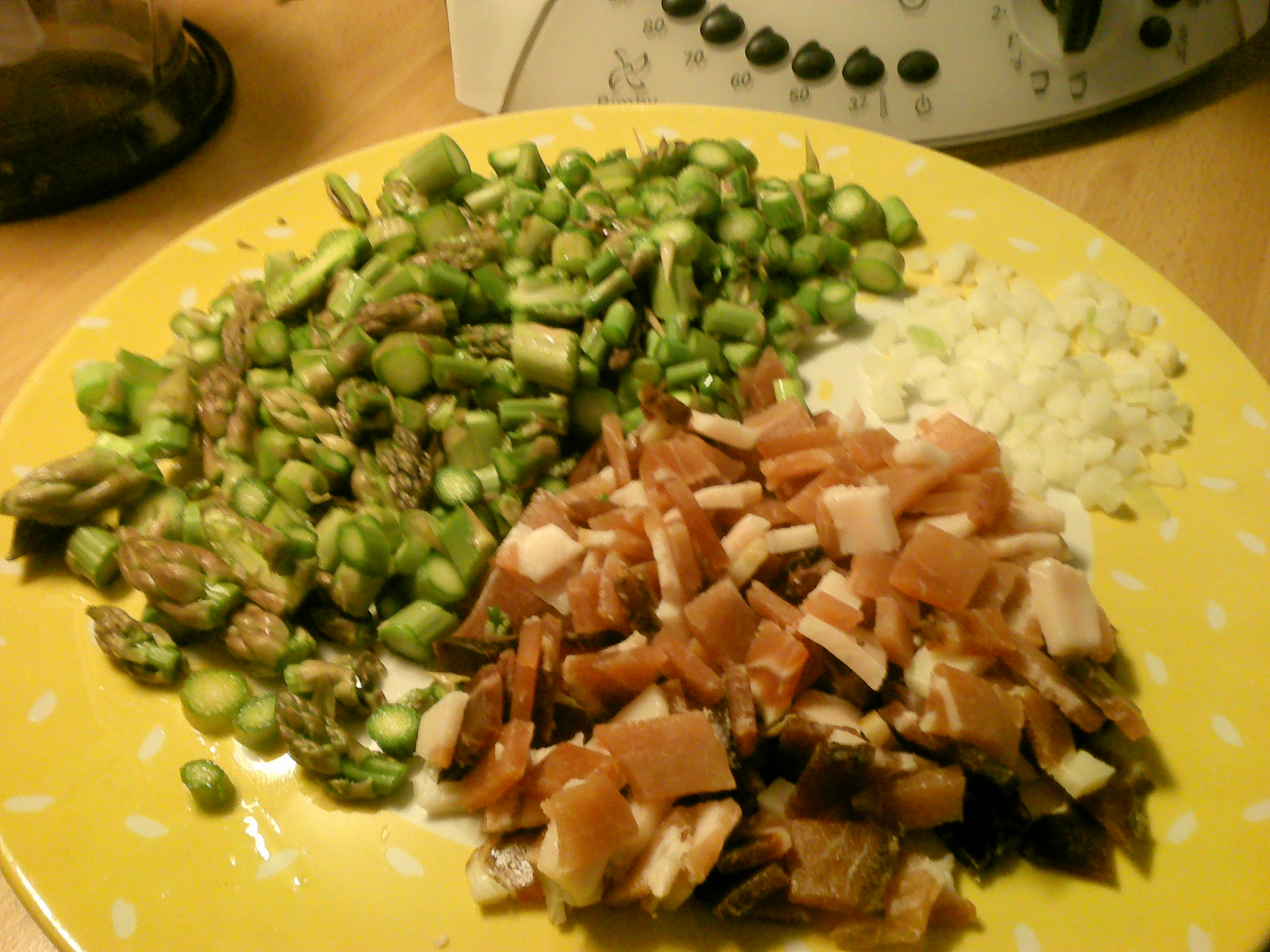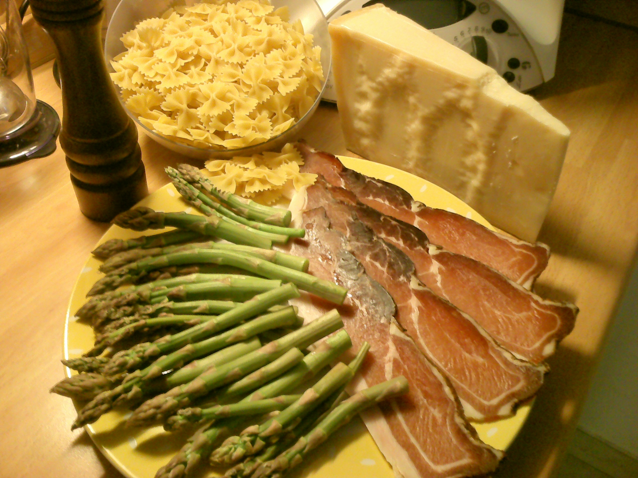 1. PREPARA IL SUGO: lava gli aspargi e taglia a rondelle,le cimette a metà, taglia a quadretti lo speck, taglia a cubettini fini lo scalogno, inserisci nel boccale 30 gr di olio aggiungi lo scalogno e soffriggi a 100° 3 min. vel. 1,aggiungi lo speck  100° 1 min. e 1/2 vel 1 antiorario, aggiungi gli aspargi, 2 cucchiai di farina, 2 bicchieri di acqua,sale e pepe 100 ° 12 min. antiorario vel. 1 , togli e metti da parte.Senza lavare il boccale aggiungi 1 litro di acqua sala e porta a bollore 13 min. 100°vel. soft antiorario,aggiungi le farfalle e cuoci per il tempo indicato sulla confezione più 2 minuti, scola bene e codisci con il sugo, aggiungi una bella grattuggiata di parmigiano e servi.