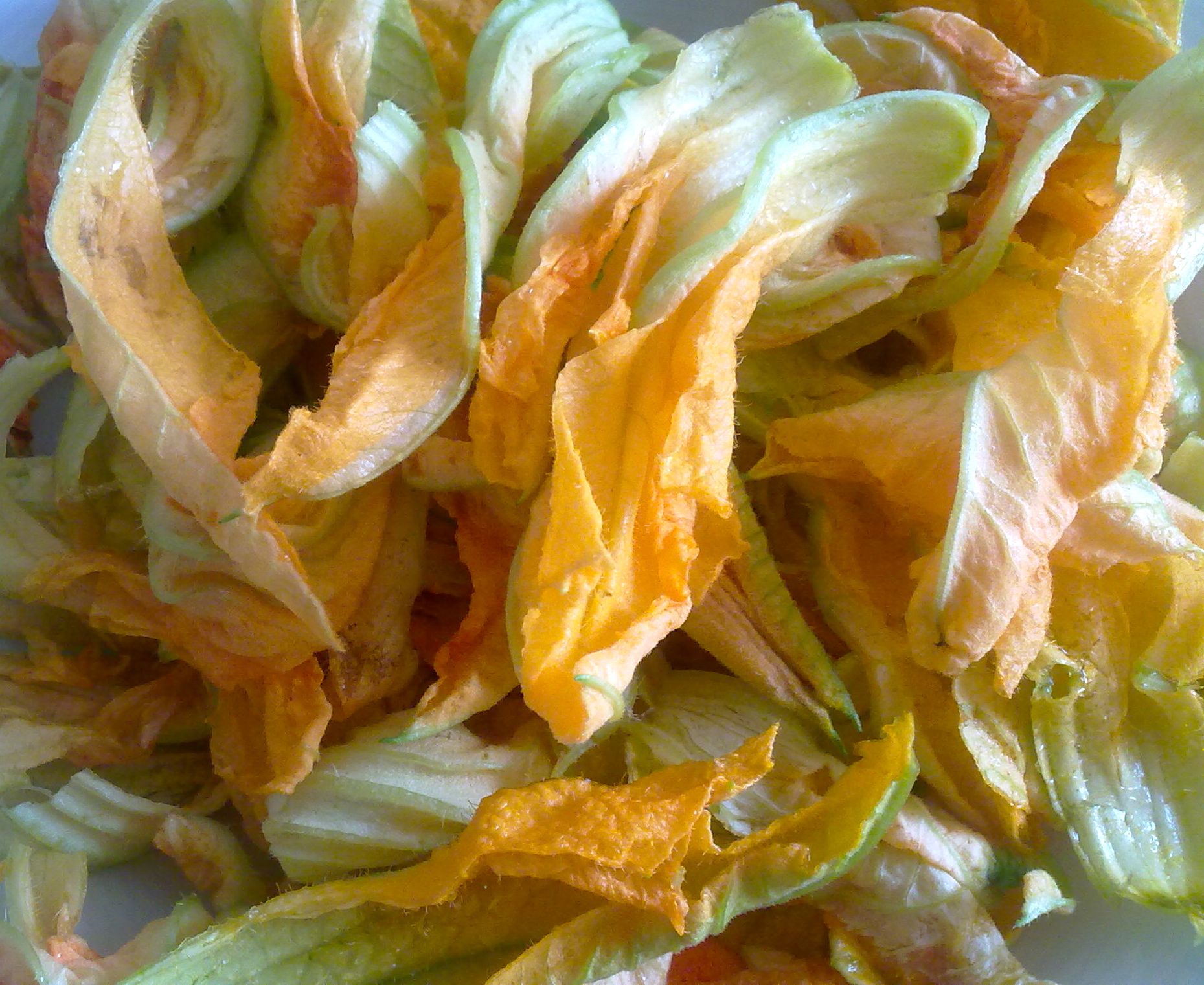 - Lavate i fiori di zucca, tagliateli a falde e teneteli da parte.