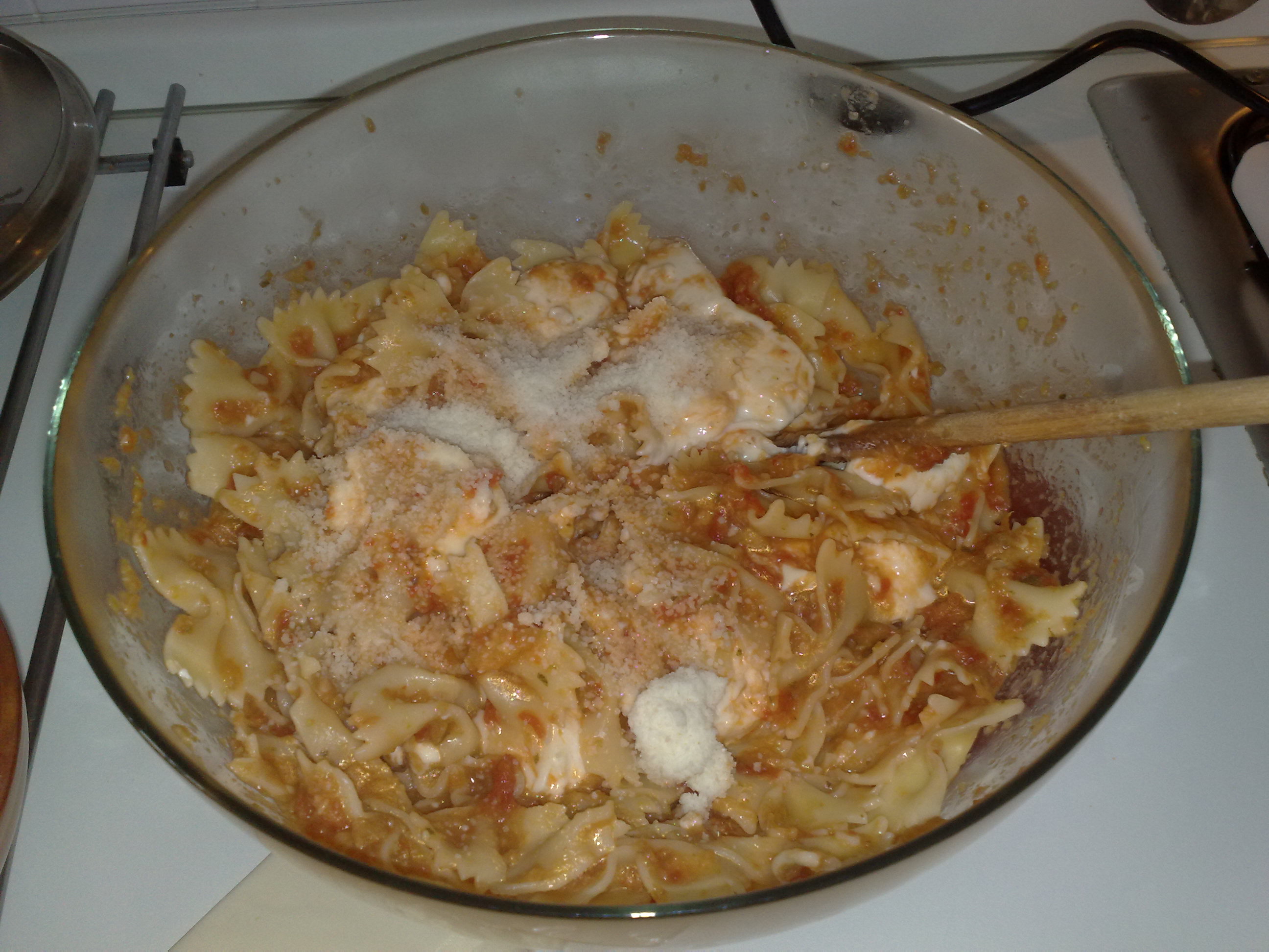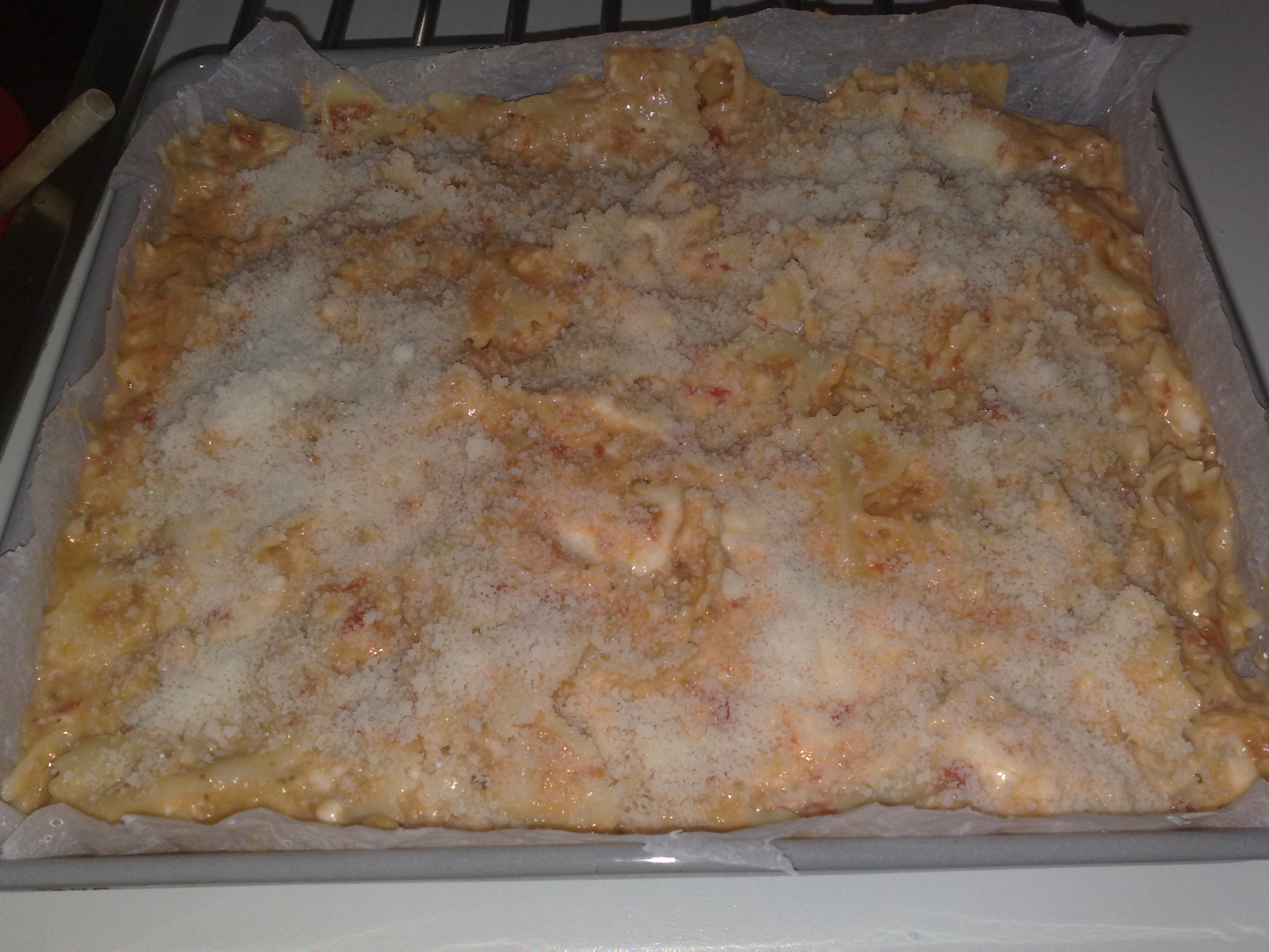 Amalgamare tutti gli ingredienti in una ciotola capiente e infornare spolverando la superficie con il parmigiano.