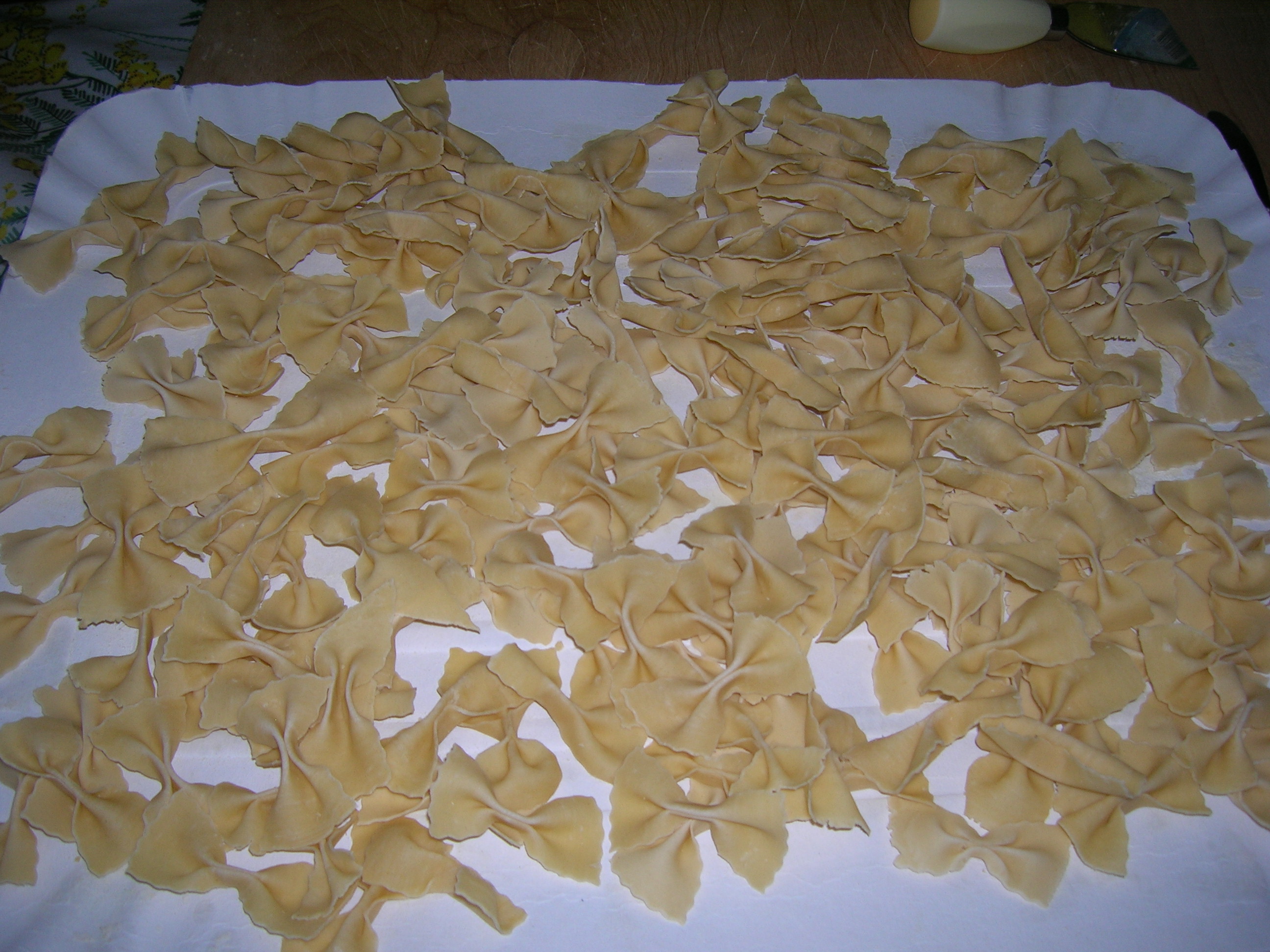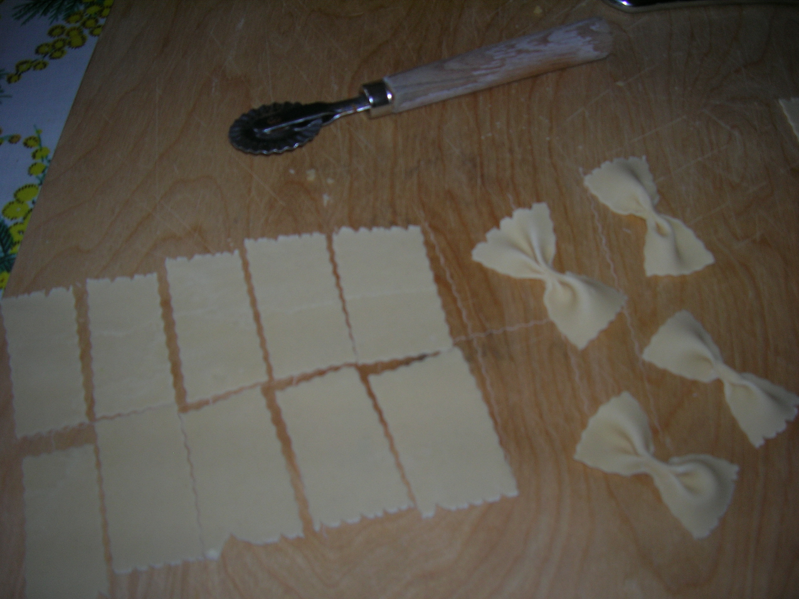 "velocità spiga" , versare il tutto in una ciotola, compattare e far riposare per 15 min.; con la macchinetta per la pasta tirare la sfoglia molto sottile in strisce da 10 cm. che andrete poi a tagliare con la rotellina ondulata per la pasta in piccoli rettancoli da 5 x 3 cm. stringendoli a fisarmonica al centro in modo da formare le farfalle. Occorre essere veloci perchè la pasta tende a seccarsi in fretta. In tal caso inumiditevi le mani mentre tirate la sfoglia. Preparate la salsina mettendo nel boccale il burro e l'olio evo, qualche pezzetto di scalogno tagliato finemente e impostare 1 min. 100°