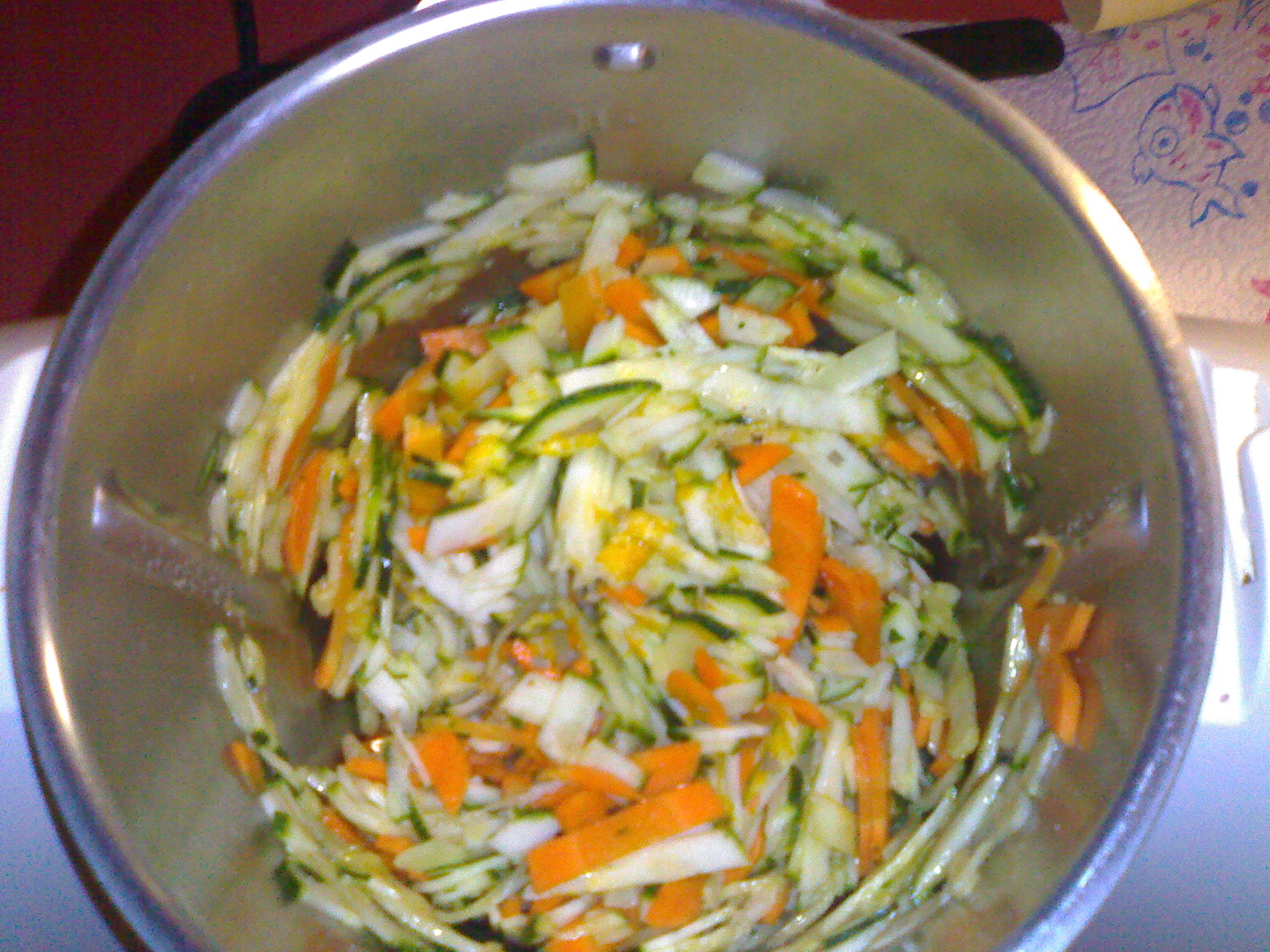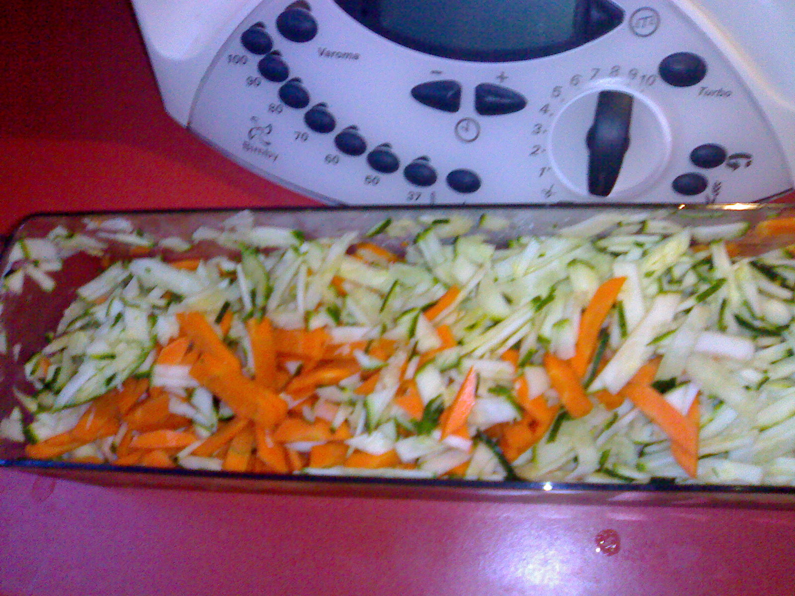 Senza lavare il boccale mettere le zucchine, le carote, l'olio, il sale, il pepe, l'erba cipollina, lo zenzero e l'alloro: 5 min. 90°