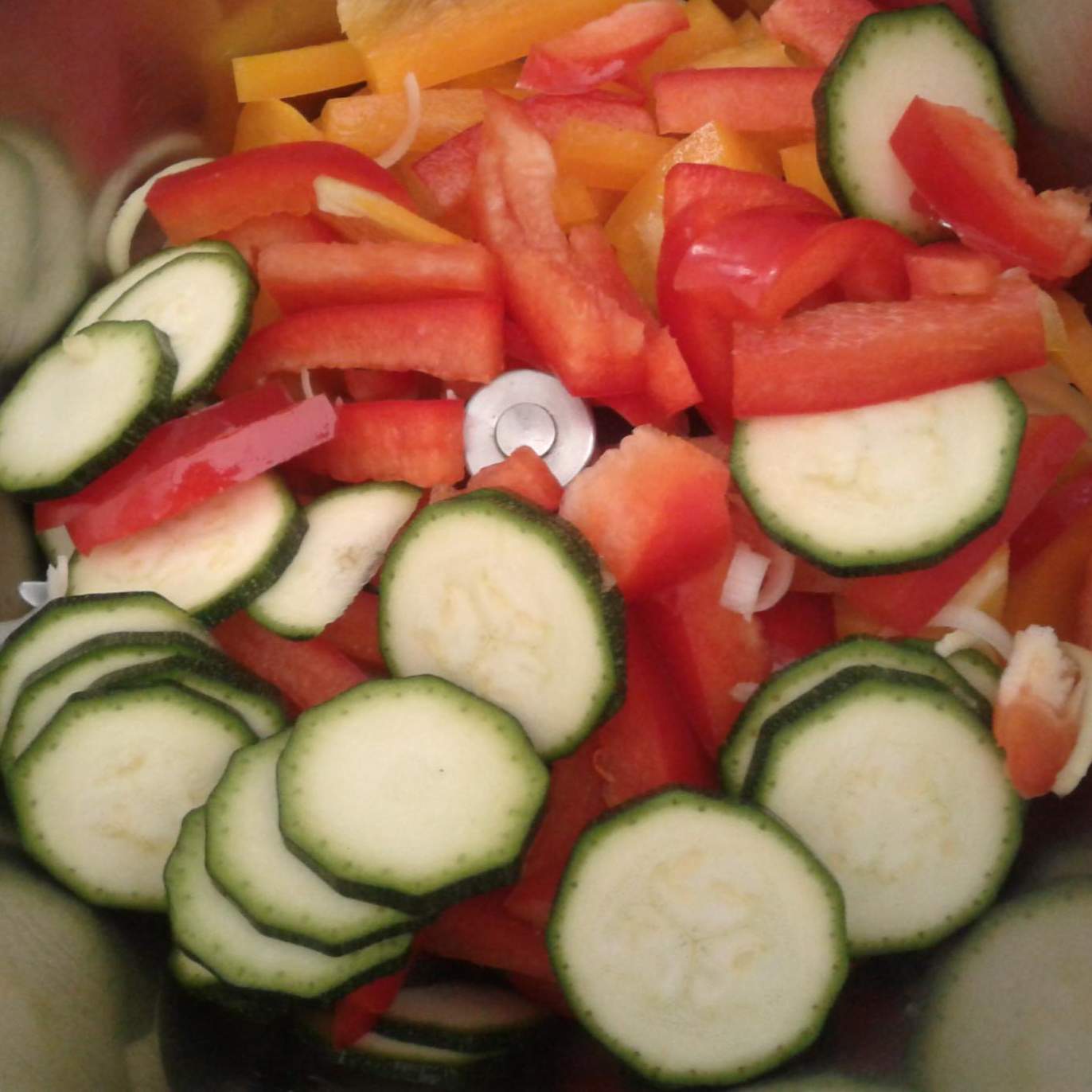 - Lavare, asciugare e ridurre a tocchetti la cipolla, a rondelle sottili la zucchina e a filetti i peperoni;