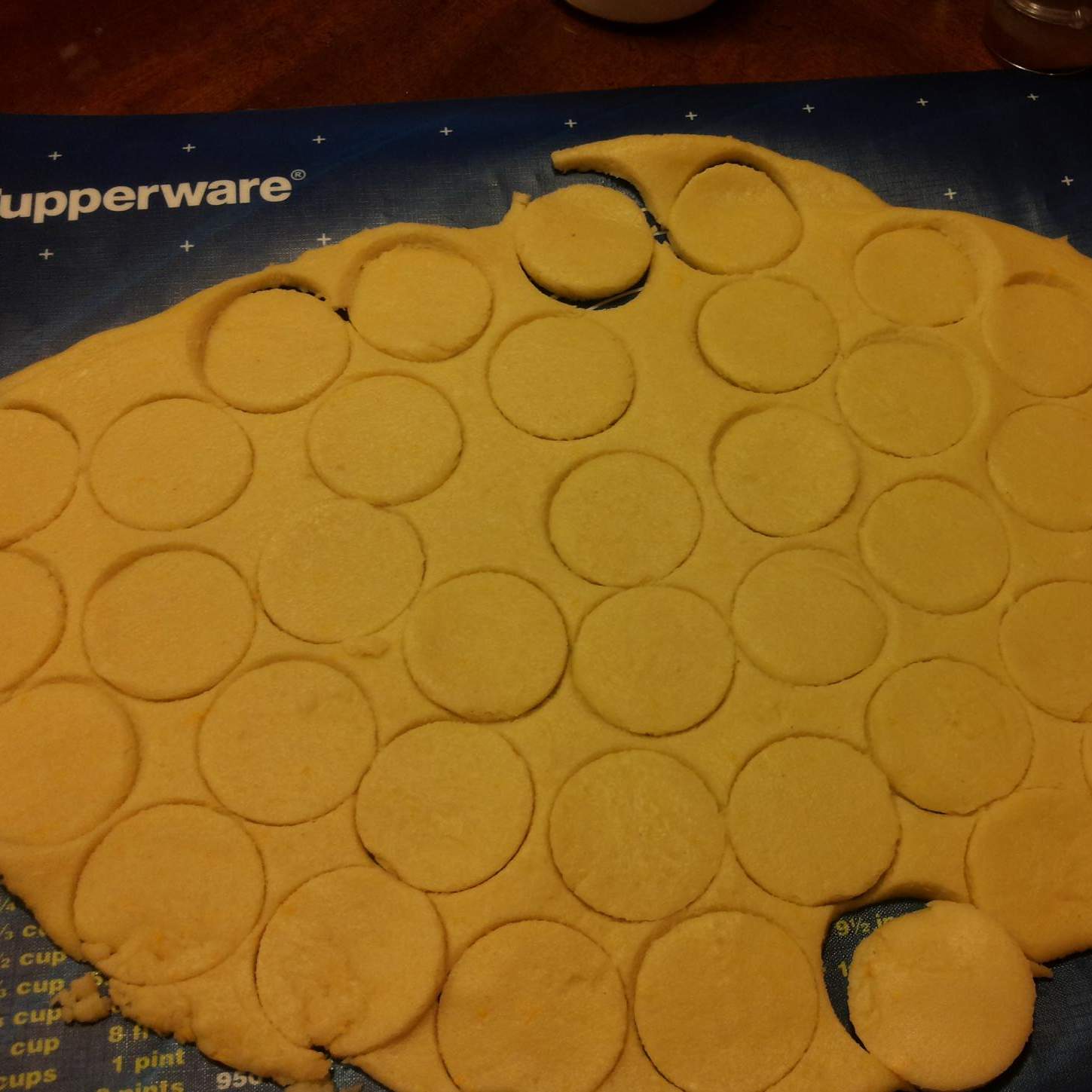 Mettere i dischetti in una teglia da forno sovrapponendoli leggermente l'uno all'altro. Reimpastare i ritagli e continuare a stendere l'impasto ricavando altri dischetti finchè l'impasto finisce.