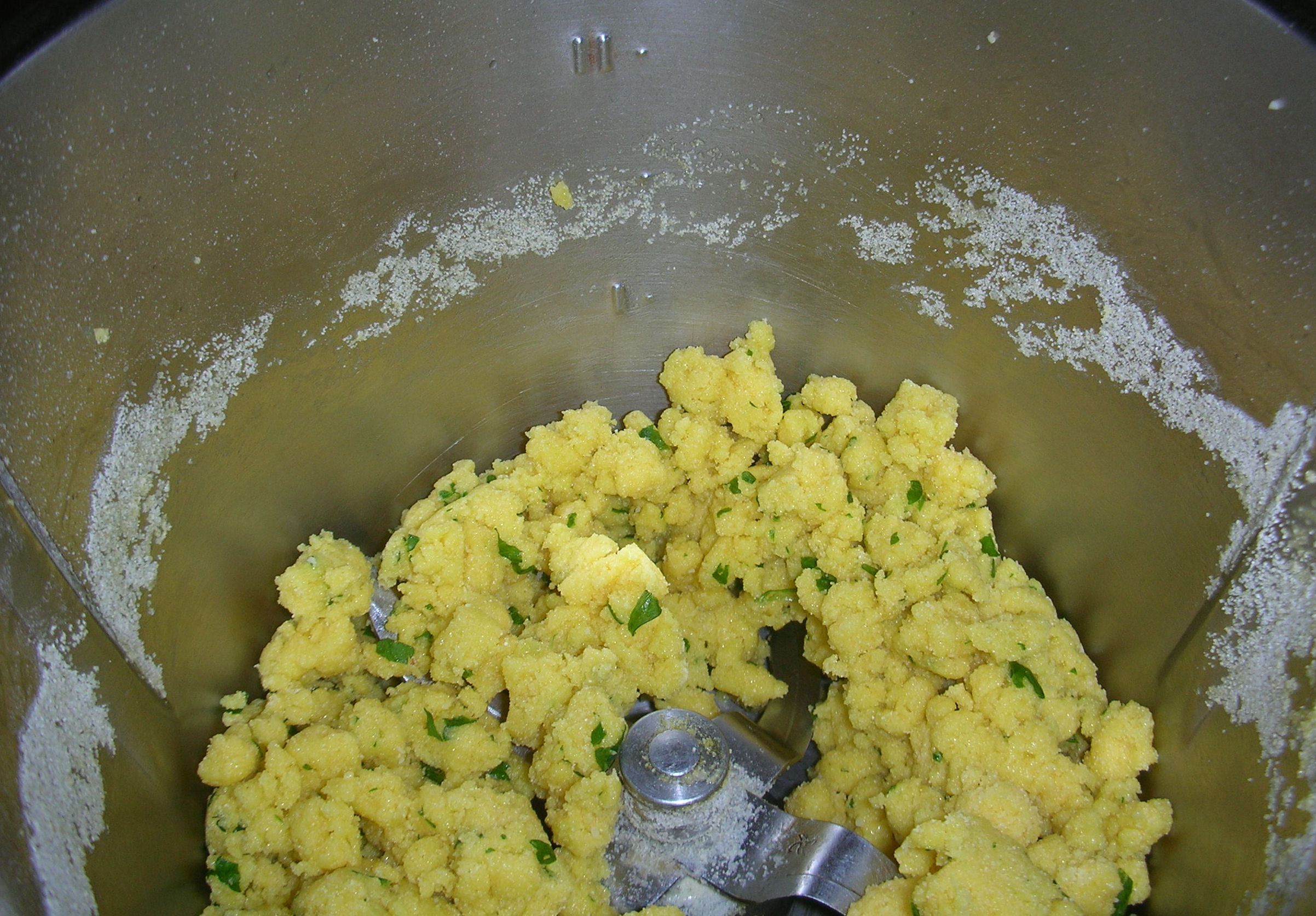 2. Versare nel boccale la farina di semola, il cui peso dovrà essere il doppio di quello delle uova, e il prezzemolo tritato, impastare: 1 min./