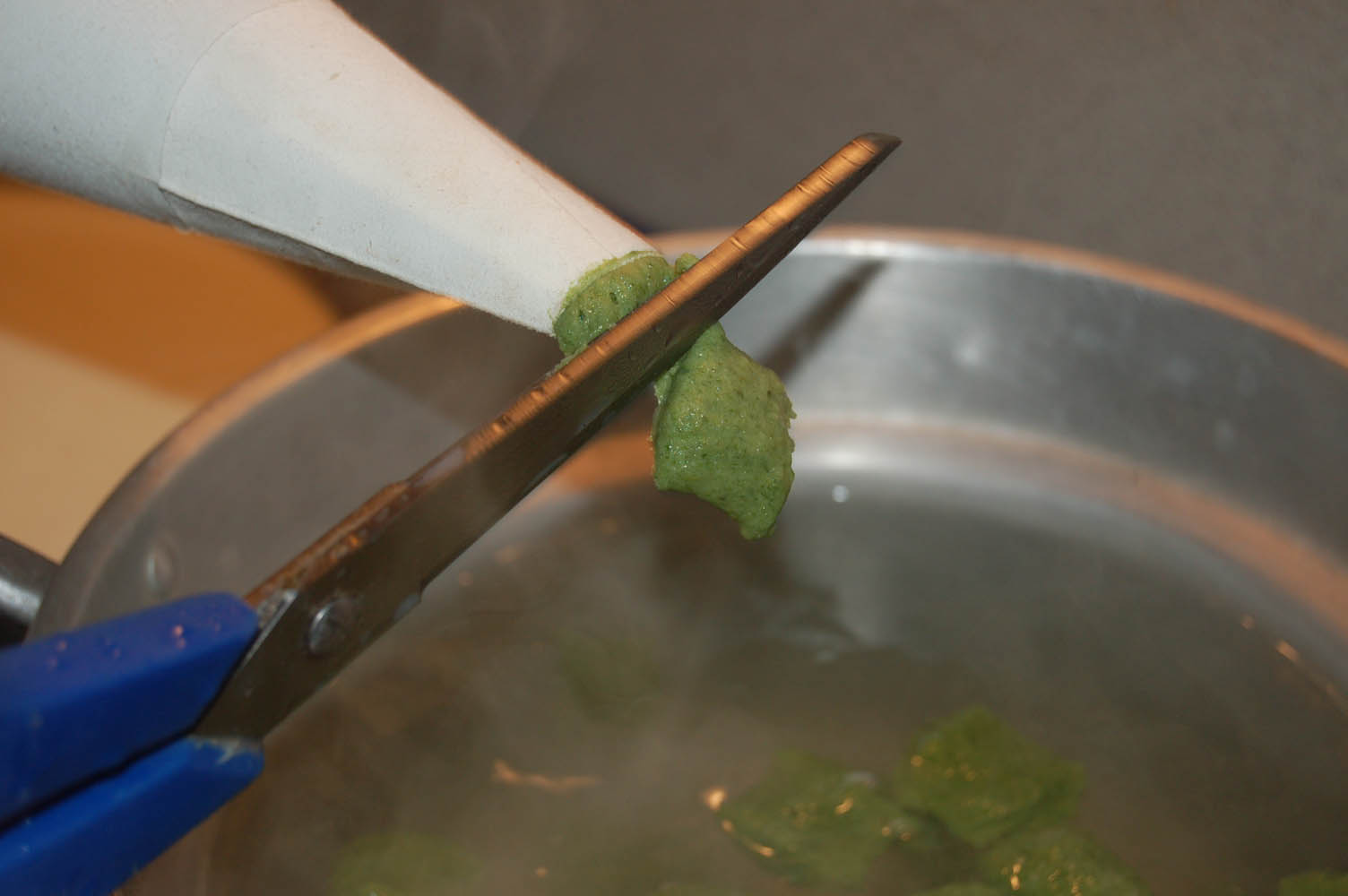 "coperchio chiuso" e travasare in una padella. In una pentola con acqua salata bollente far cadere l'impasto a poco a poco dalla sacca da pasticcere, tagliando gli gnocchi con le forbici (vedi foto). Nello svolgere questa operazione, ricordarsi di mescolare di tanto in tanto l'acqua con gli gnocchi già pronti. Scolare gli gnocchi nella padella con il condimento e saltare per qualche secondo, aggiungendo a piacere dell'altro parmigiano grattugiato. Servire caldi.