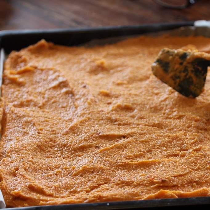 Trasferire in una placca da forno ricoperta di carta forno il composto degli gnocchi e livellare con la spatola, quindi aspettare 15 minuti che il tutto si freddi.