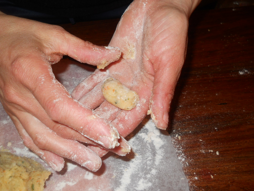 - Trasferite l'impasto dei nostri gnocchi su carta forno formate un salame e cominciate a fare gli gnocchi se serve con l'aiuto di un po' di farina;