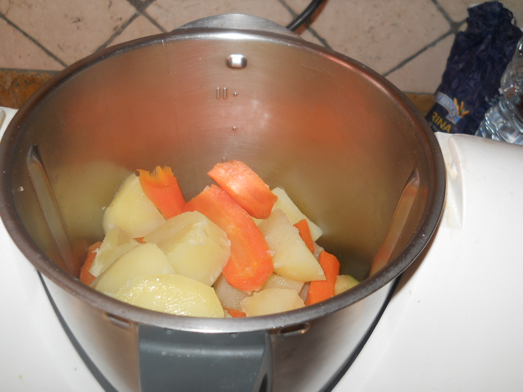 - A questo punto mettere l'acqua fino alle lame e mettere nel cestello carote e patate, cuocerle per 25 min./Varoma/Vel. 1;