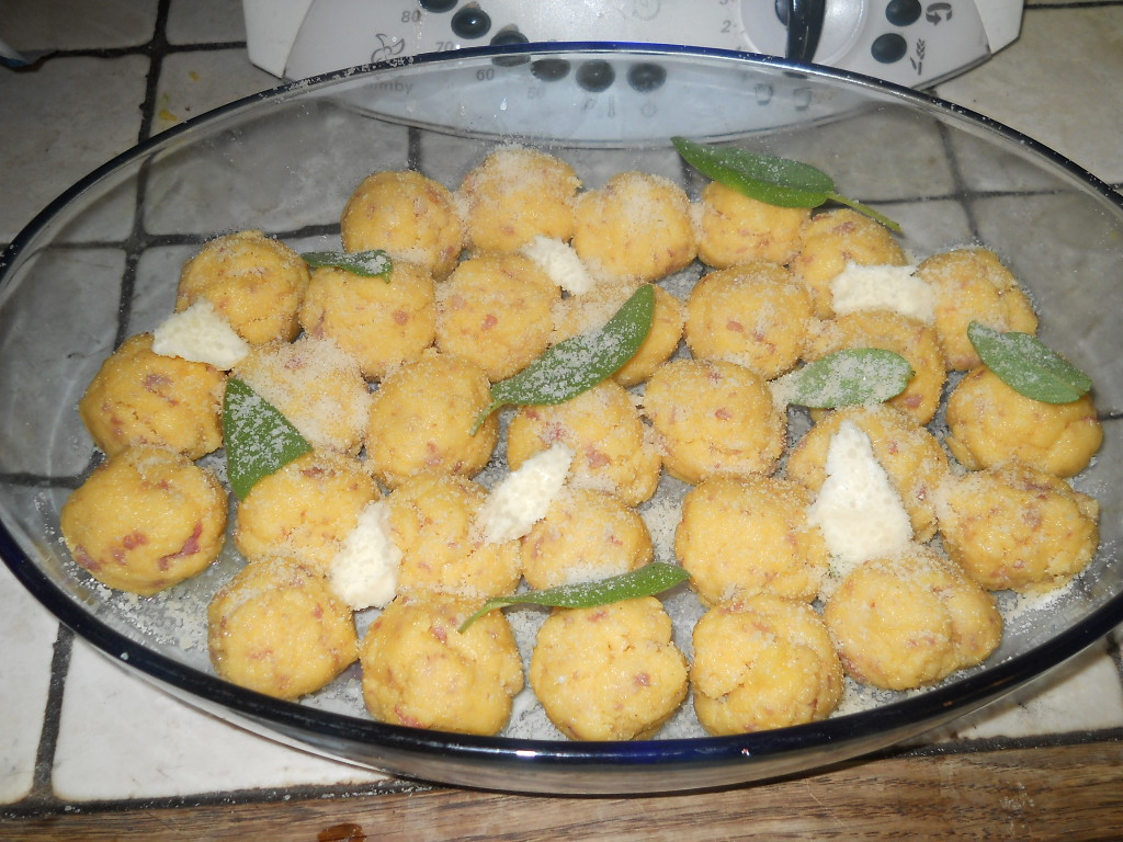 Traserite la polenta in una ciotola e senza scottarvi prendete un po' di impasto di polenta e formate delle palline un po' piu' grosse di una noce; prendete una pirofila imburrate il fondo e posizionate i nostri gnocchi di polenta e, con una noce di burro e salvia, mettere in forno per 20 Minuti 180° quando sono pronti dovete servirli con burro fuso e salvia