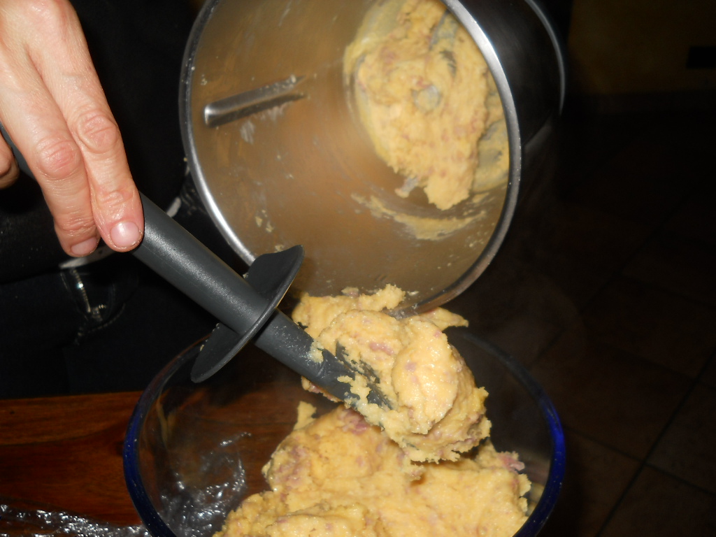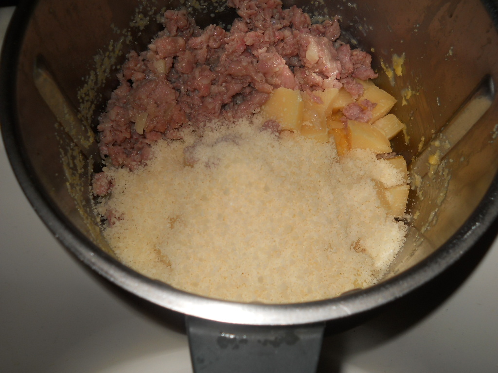 Dopo i 10 minuti di cottura inserite dal foro la spatola e continuate la cottura per altri 5 minuti quando mancano 2 minuti alla fine della seconda cottura fermate il bimby e aggiungete grana grattuggiato, il bagoss a dadini, la salamella, il latte e finite la cottura, nel frattempo accendere il forno a 180°