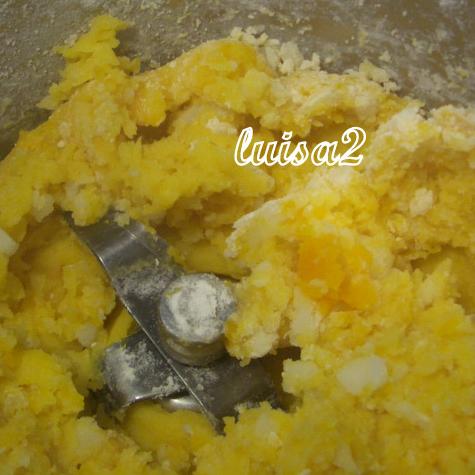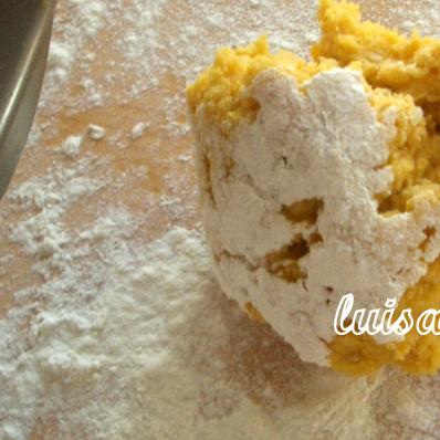 "coperchio chiuso" , mettervi le patate e la zucca con 50 g di farina presa dal totale: 5 sec vel 5, aggiungere la restante farina ed i sale: 10 sec vel 5.Versare l'impasto sulla spianatoia infarina, formare una palla, staccarne un pezzetto alla volta, formare un rotolino e tagliarlo in pezzetti di circa 1 cm. Tenere sempre infarinati gli gnocchi.