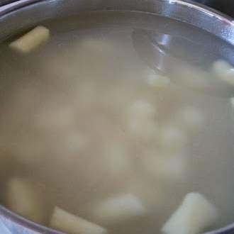 Sbucciare e tagliare a tocchetti uguali le patate, cuocerle al vapore nel Varoma in 500 gr di acqua 25 minuti temperatura varoma velocità 3.