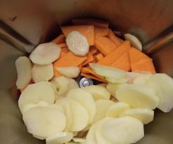 - Mettere nel boccale le zucca, le patate, l'acqua e il sale; cuocere per 15 min./Varoma/vel.
