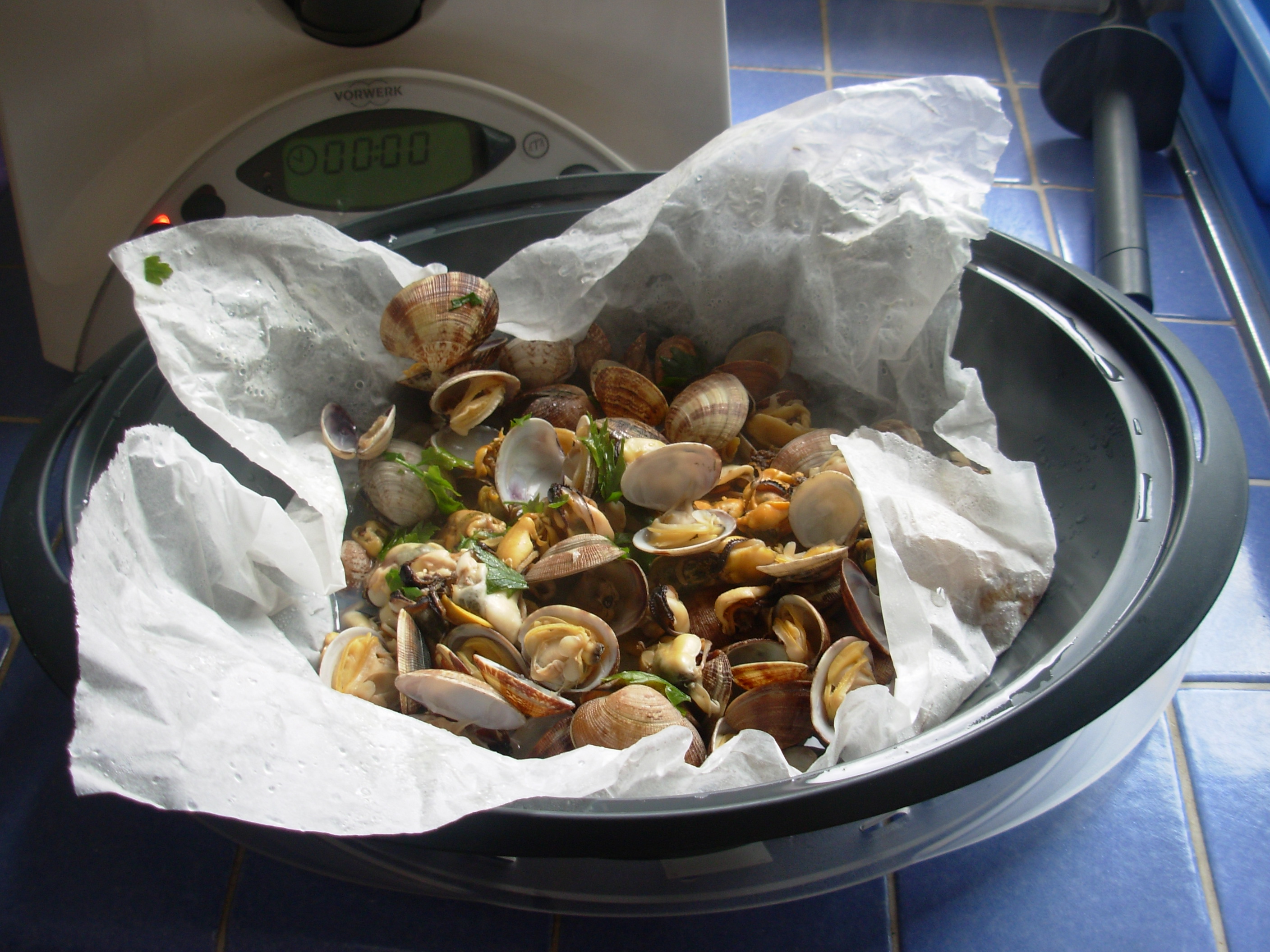 Foderare il recipiente del Varoma con carta forno bagnata e strizzata, sistemare le cozze e le vongole, spolverizzare con metà del trito di prezzemolo e aglio, insaporire con un pezzetto di peperoncino e irrorare con 20 g di olio, mescolare bene, coprire il recipiente con carta stagnola e chiudere con il coperchio del Varoma.