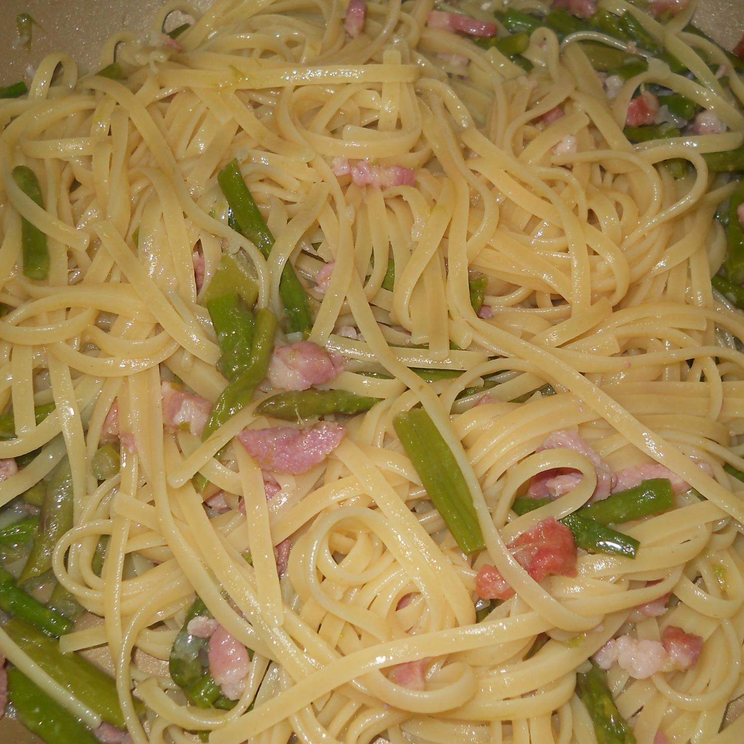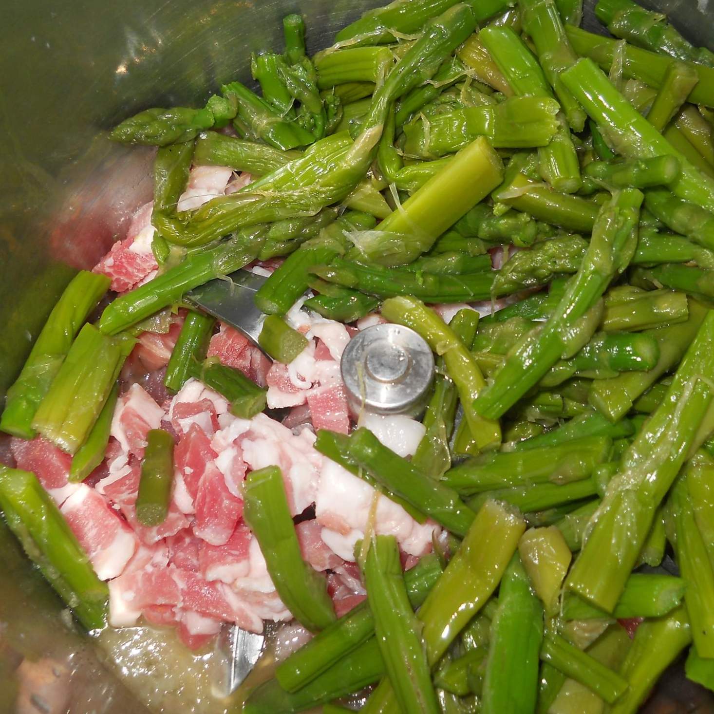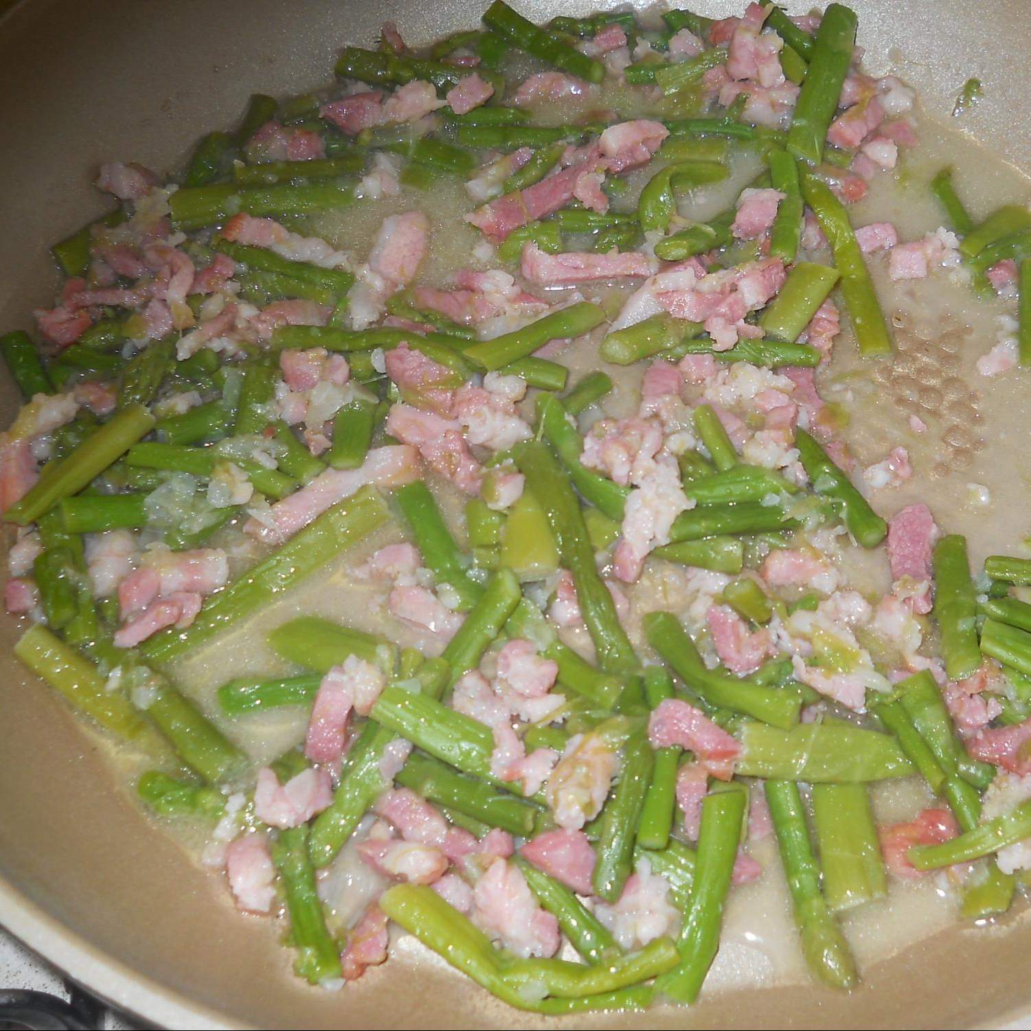 Una volta fatto il soffritto unite gli asparagi pancetta sale q.b. e pepe q.b. e cuocere il tutto per 5 Minuti 100°
