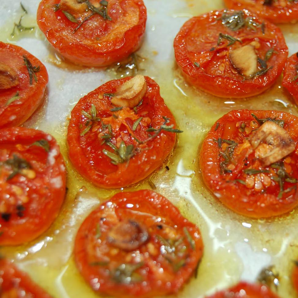 Infornate i pomodorini e lasciateli caramellare per un'ora e mezza.