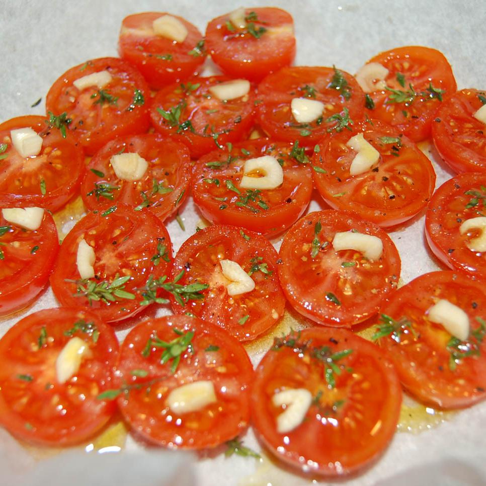 Condire i pomodorini con sale, pepe, una fettina d'aglio, foglioline di timo fresco, e poi cospargervi sopra lo zucchero (la quantità è un po' a occhio: fate finta che li stiate salando abbondantemente