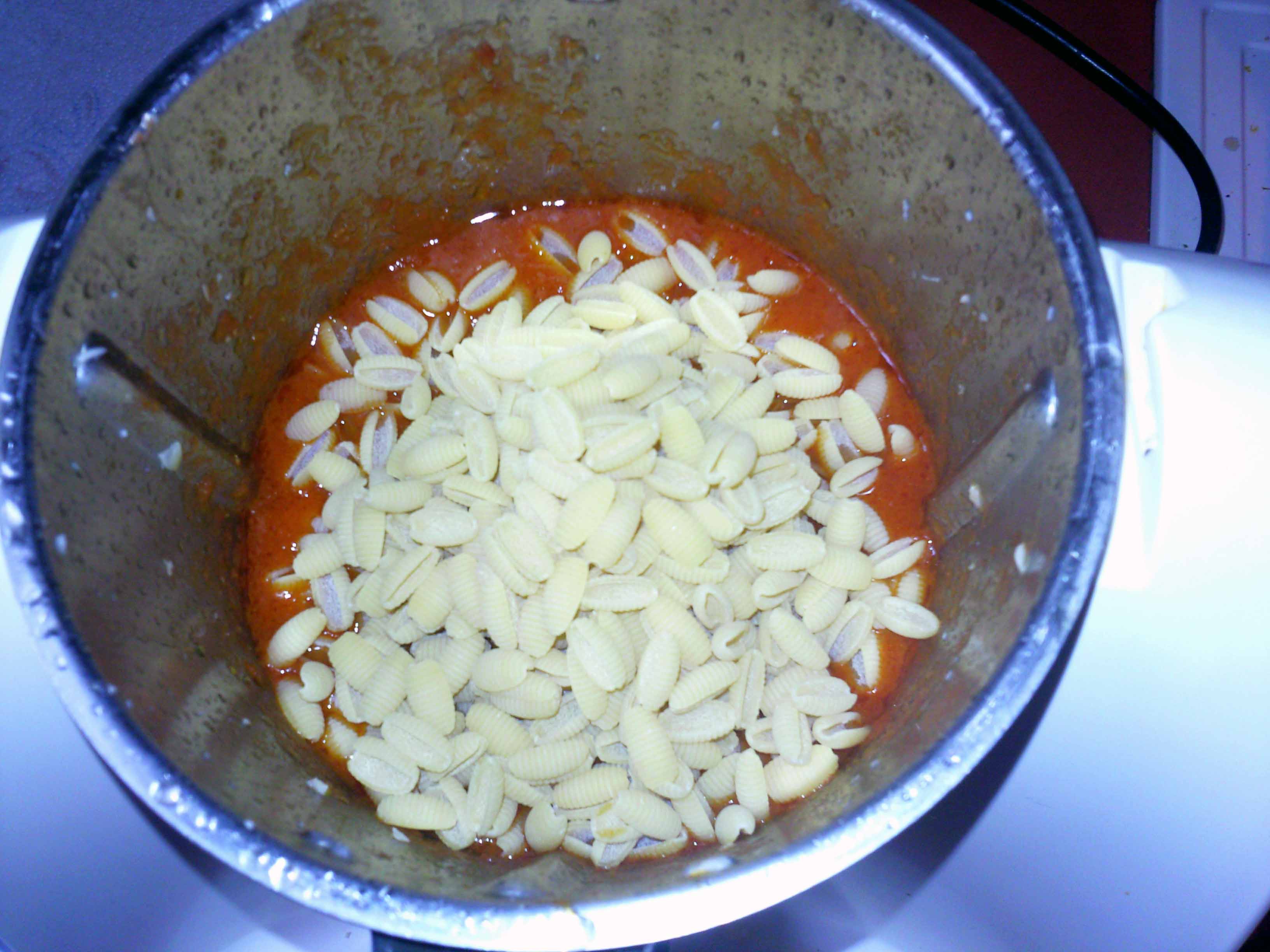 - Aggiungere il dado, i peperoncini e la passata: 10 min./100°/vel. 1.