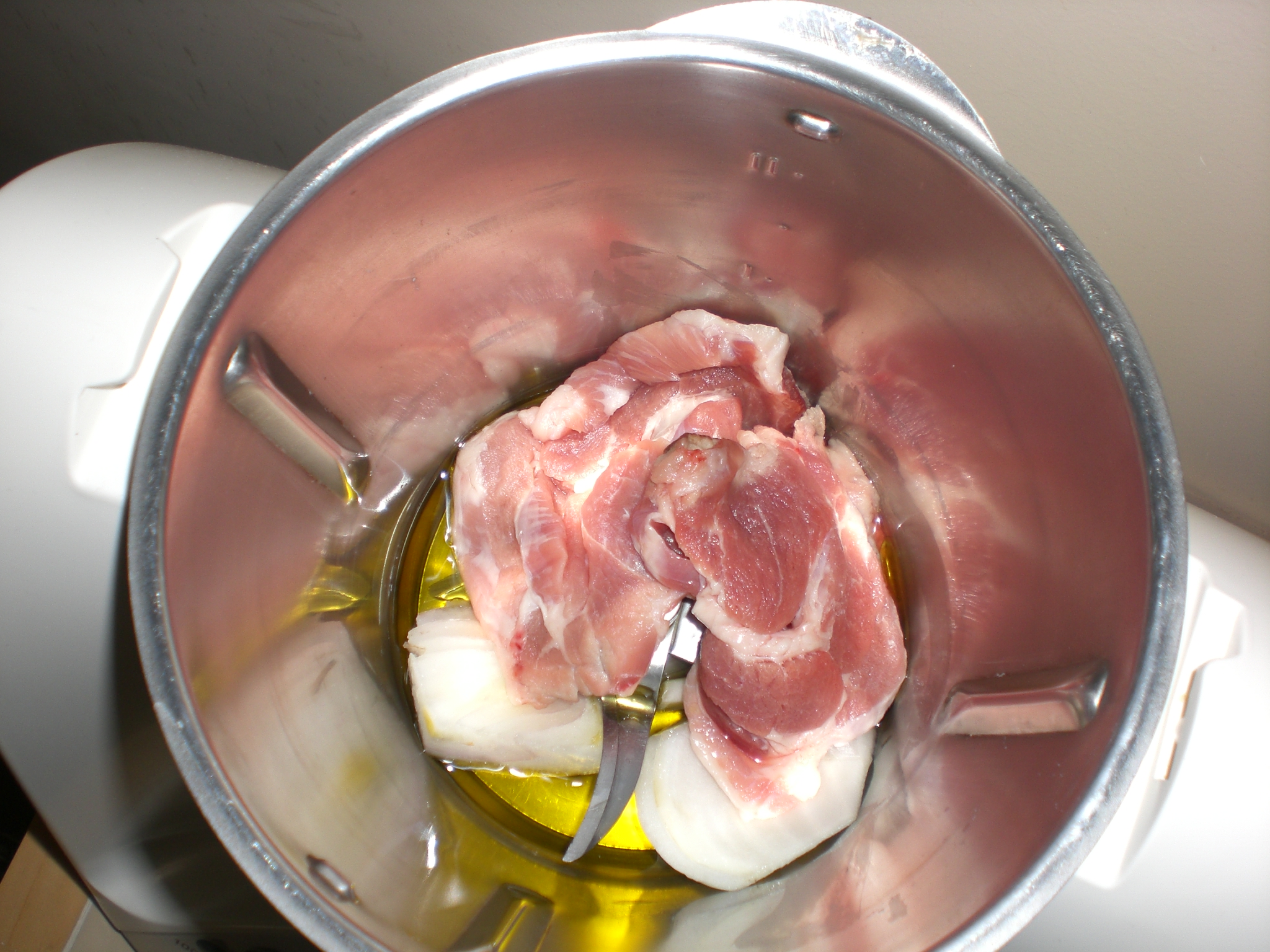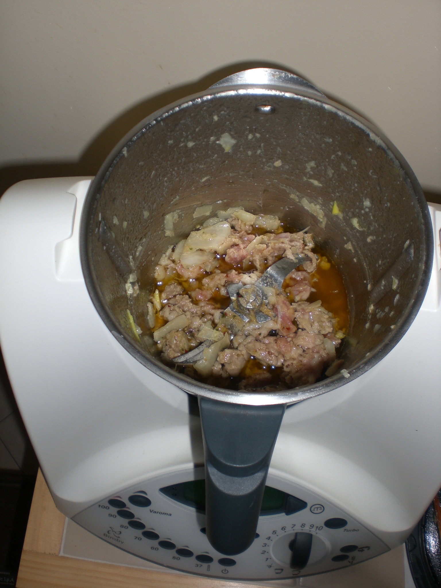 mettere nel coperchio chiuso"coperchio chiuso" la cipolla e la coppa vel.turbo per due tre volte, vel.1antiorario"antiorario" 100° 6min.