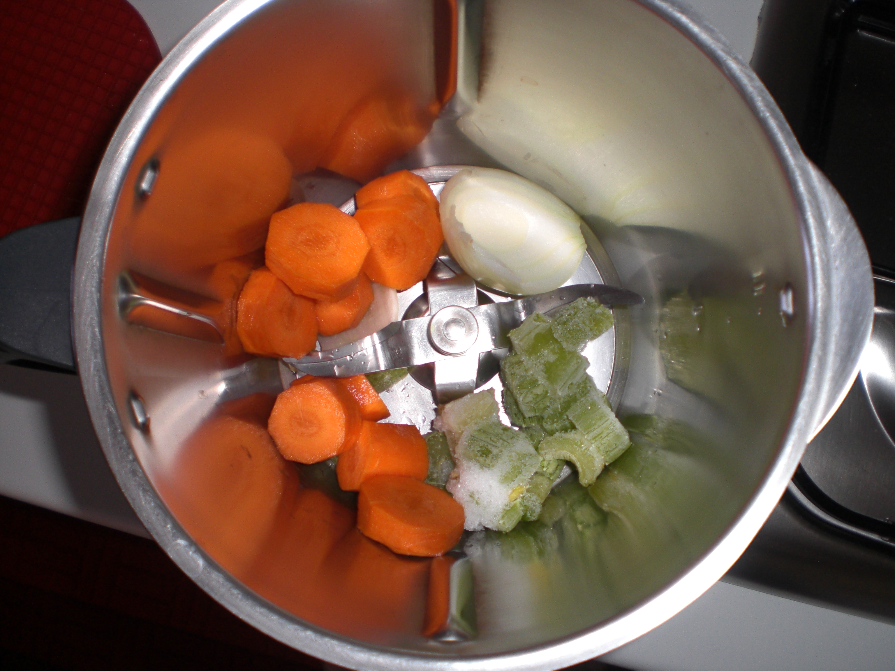 - Inserire nel boccale la cipolla, il sedano e la carota 5sec./vel.4-5.
