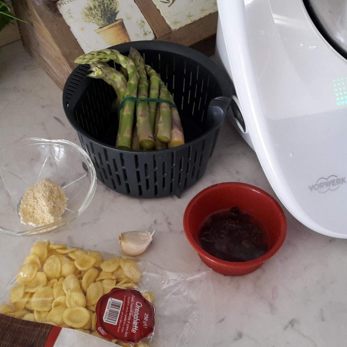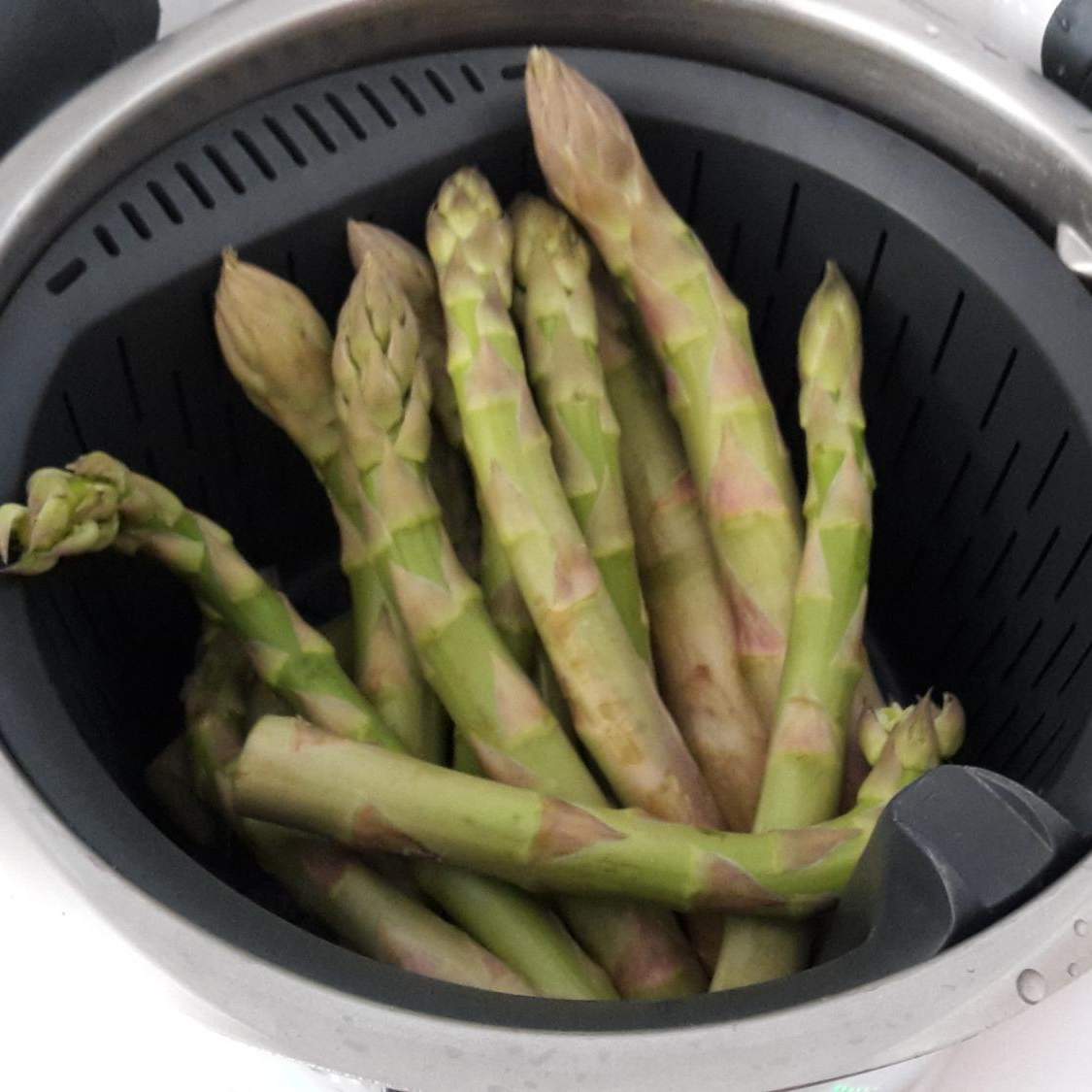 "coperchio chiuso" . Salare. Posizionare gli asparagi nel cestello e cuocerli per 18 minuti temp Varoma vel 1. A fine cottura prelevarli dal cestello tagliarli a pezzi e lasciare le punte da parte. Togliere l'acqua dal