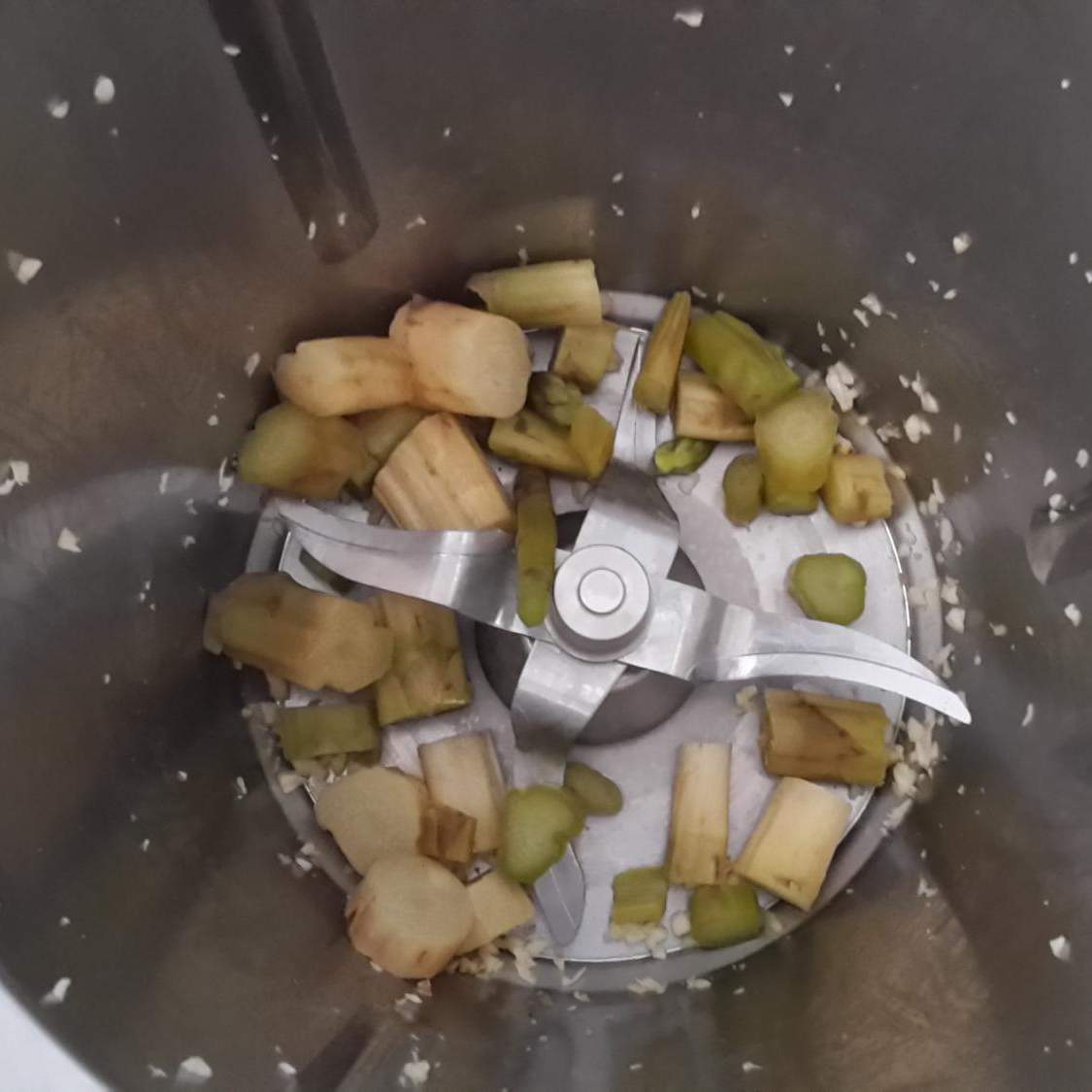 "coperchio chiuso" , tritare per 8 sec vel 5, riunire sul fondo con la spatola. Aggiungere gli asparagi a pezzi (escluse le punte) e tritare per 5 sec vel 6.