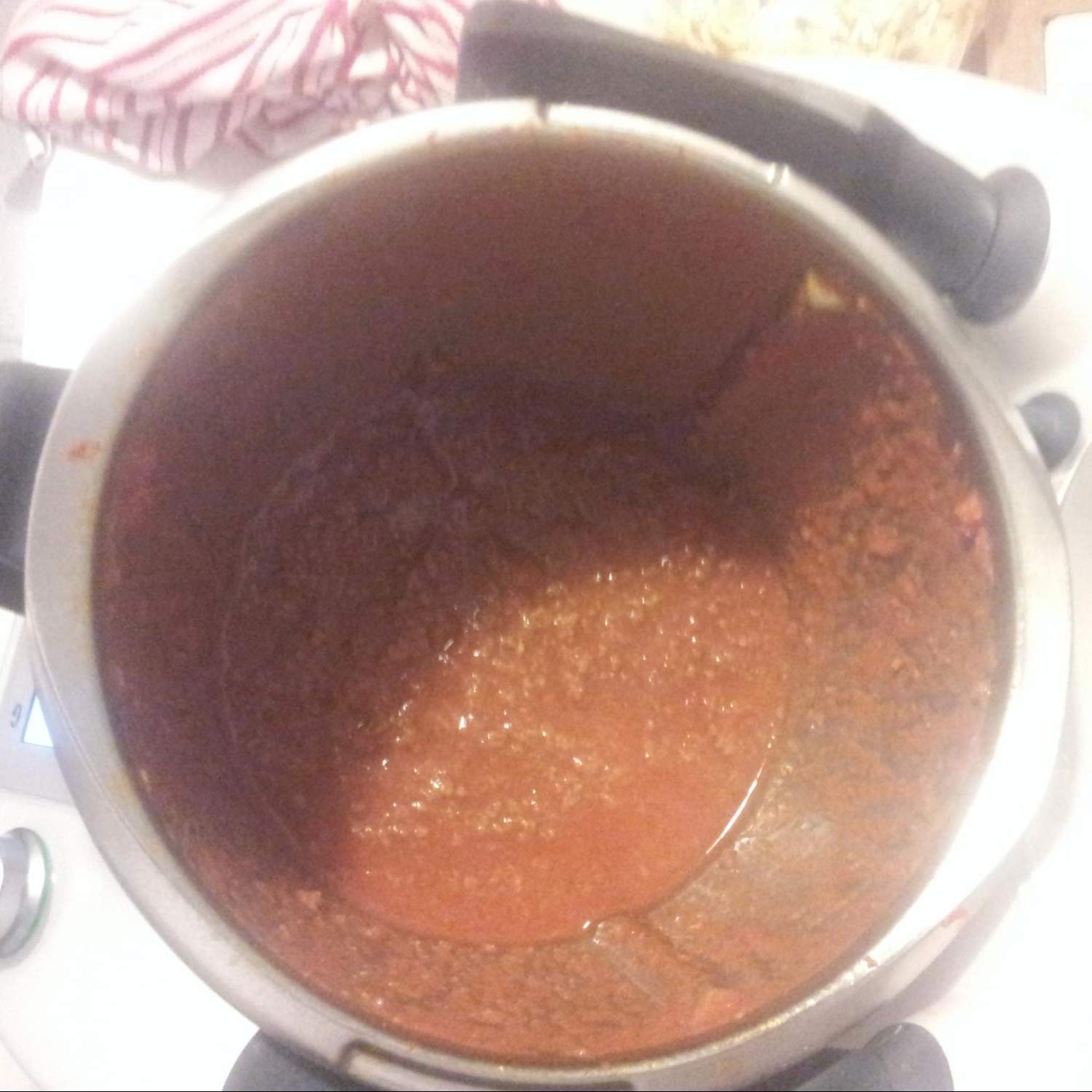 "coperchio chiuso" e tritare per 10 sec a vel 5. 2. Aggiungere l'olio e soffriggere per 3 min 120° vel 1. 3. Aggiungere la carne tritata e rosolare per 1 min 100° vel 2. 4. Versare il vino e sfumare per 1 min 120° vel 1.