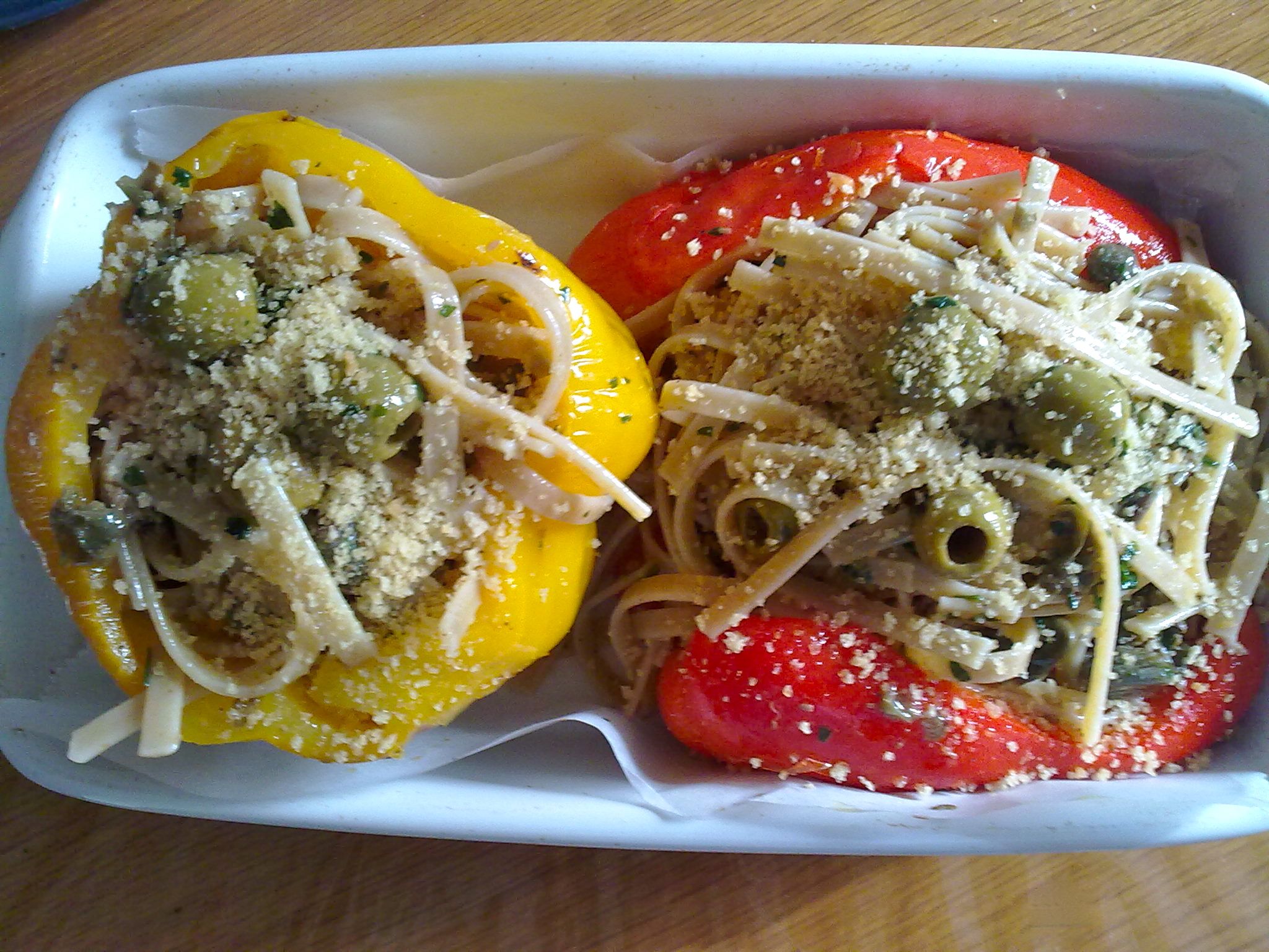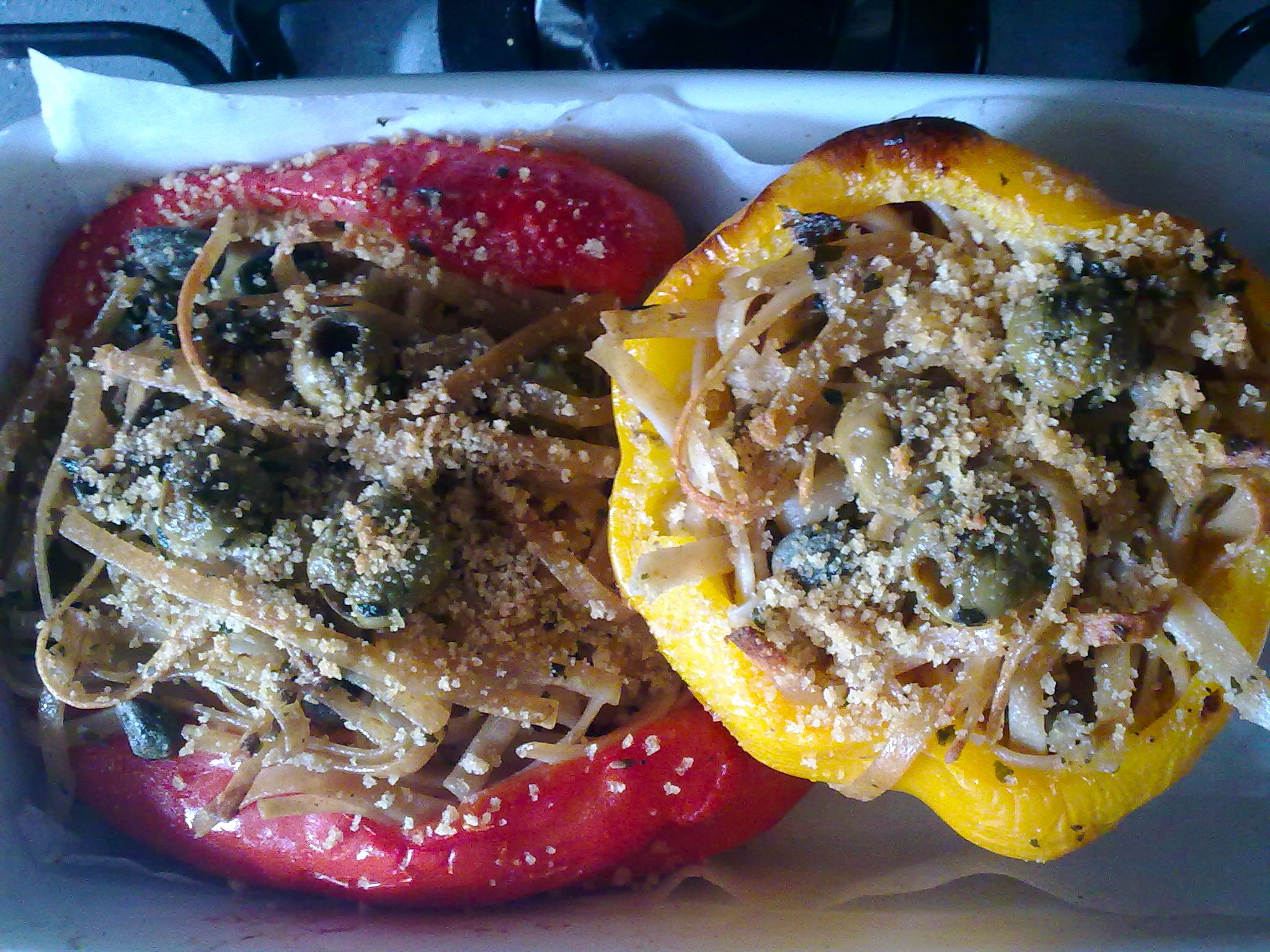 - Quando tutto sarà pronto, mescolate bene le trenette con la salsa e poi imbottite i peperoni;
