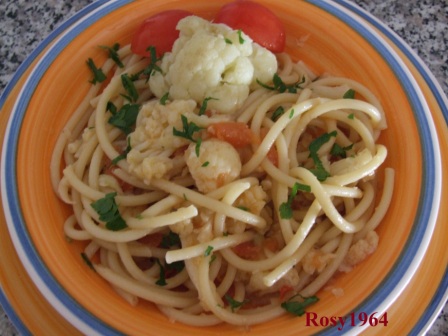 Versare in una zuppiera la pasta, il condimento di cavolfiore, il rimanente olio e se necessario ancora un pochino di acqua di cottura della pasta e mantecare con cura.