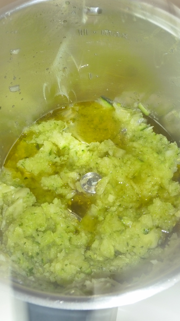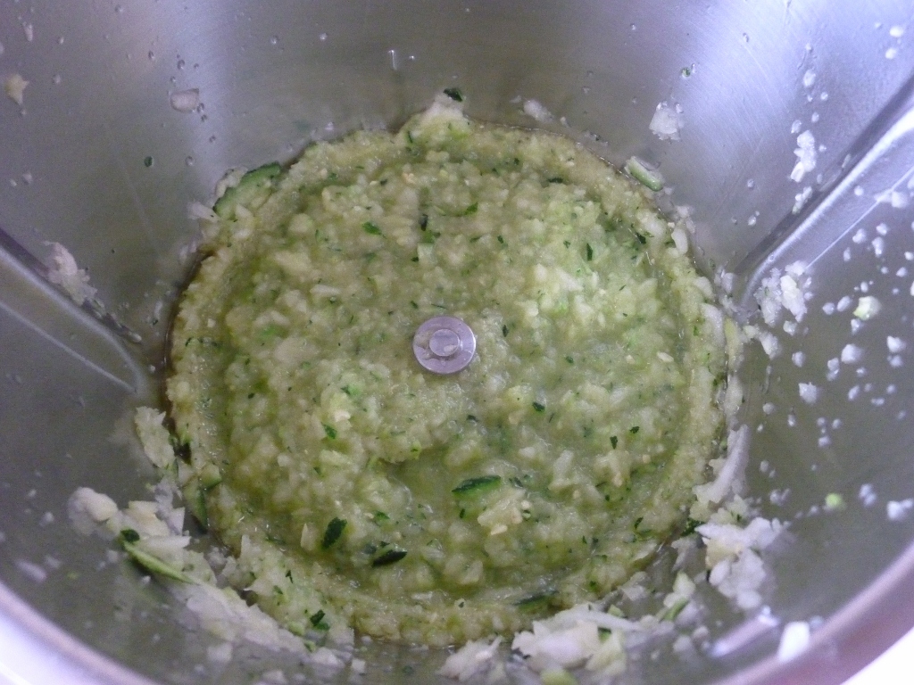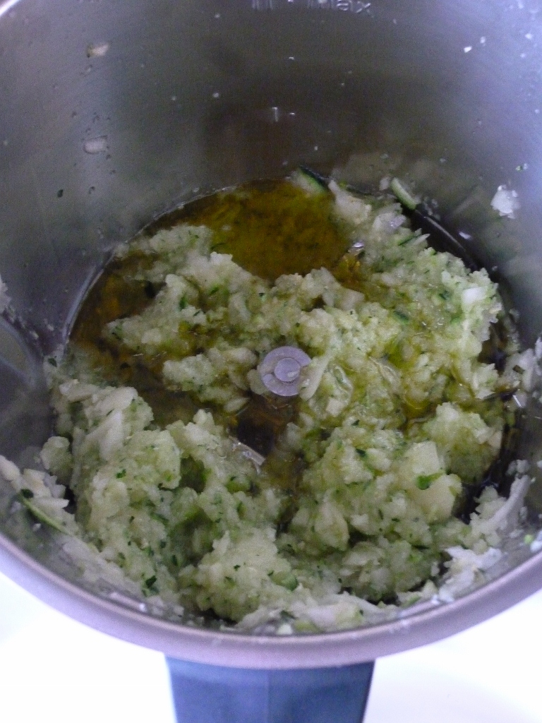 Trita le zucchine 3/4 secondi a vel. 4, aggiungi 20 gr di olio e cuoci 10 minuti 100° vel, 1, col misurino inclinato.